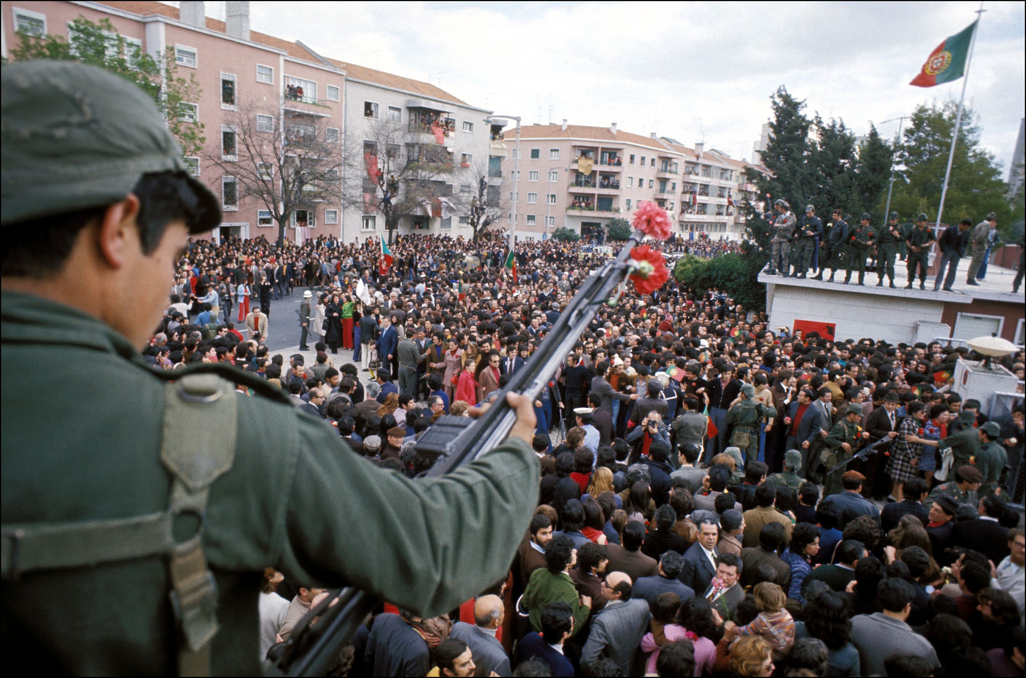 A scene from the “Carnation Revolution”, the mostly peaceful coup that took place in Lisbon, Portugal, on April 25, 1974. Military officers overthrew a dictatorial government that had ruled for decades, setting the stage for democratic rule. .(Photo by Jean-Claude Francolon/Gamma-Rapho via Getty Images)