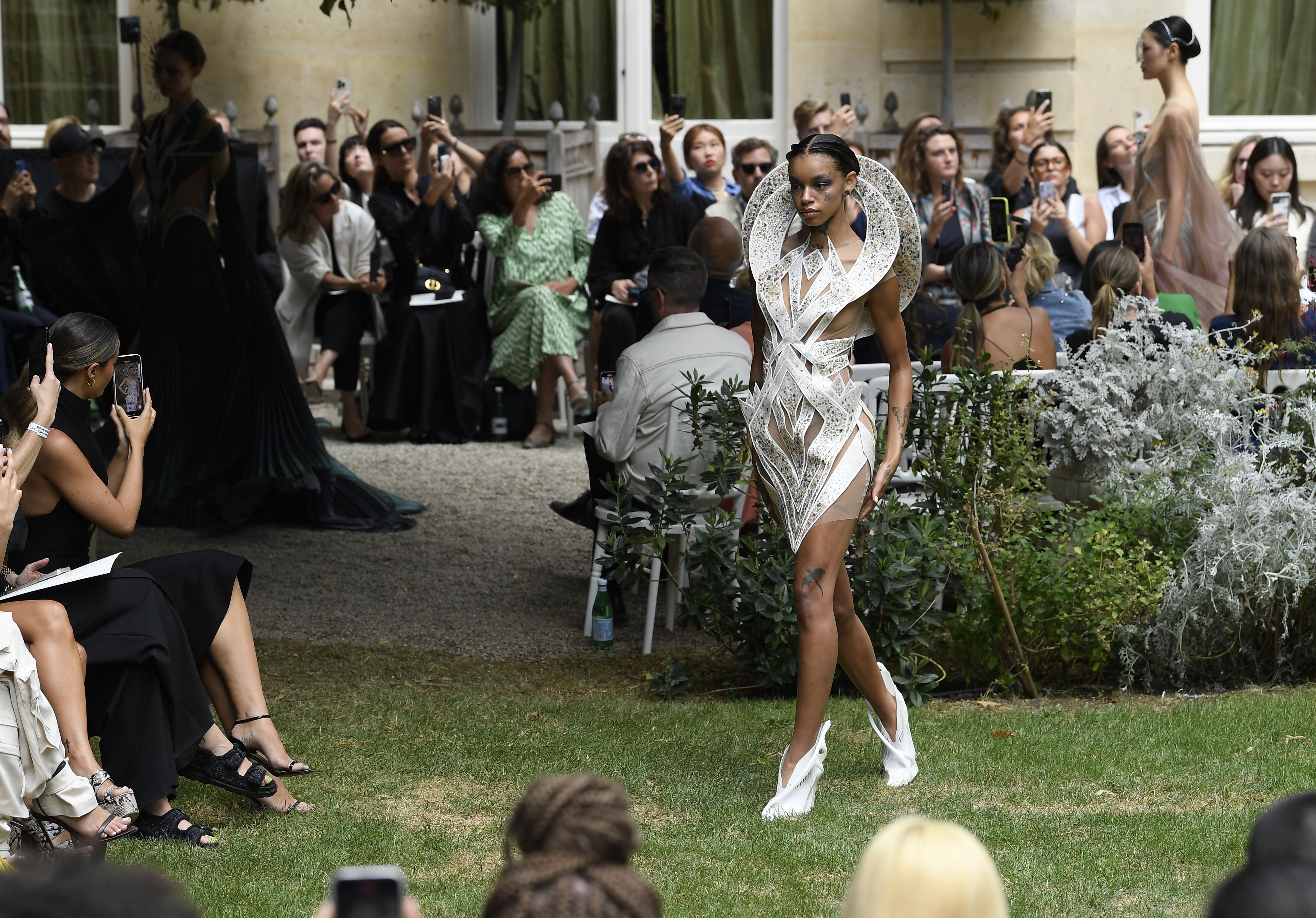 A model on the runway at the Iris Van Herpen Fall 2023 Couture Collection Fashion Show on July 3, 2023 in Paris, France. (Photo by Giovanni Giannoni/WWD via Getty Images)