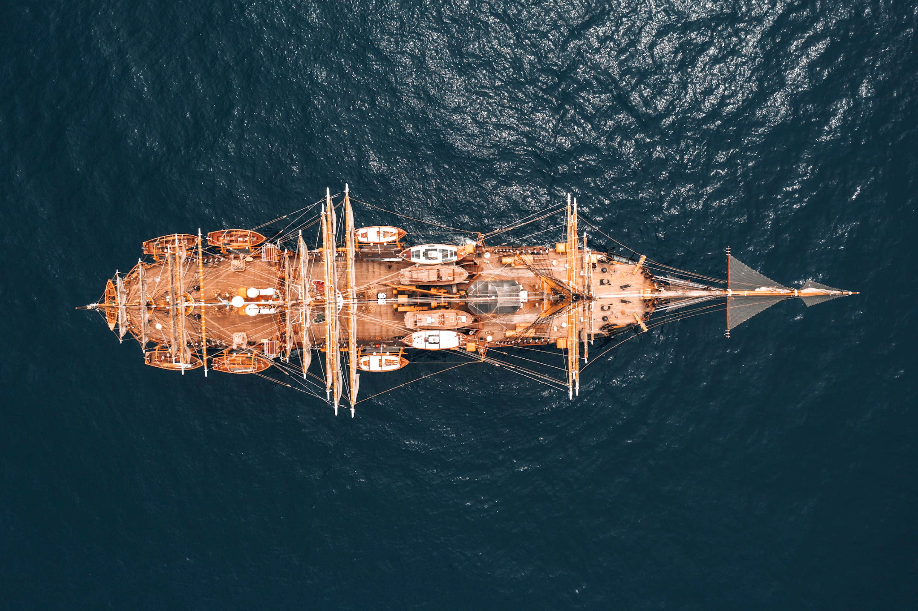 A handout photo made available by Italian Navy Press Office shows an aerial view of the Italian ship Amerigo Vespucci leaving from Genoa on world tour, Genoa, Italy on July 1, 2023. Italian naval academy flagship sailboat Amerigo Vespucci, one of the world's most iconic “tall ships”, is to take Italian products in 'Made in Italy' global tour for 20 months visiting 28 countries and 31 ports. (Photo by Italian Navy Press Office/EPA/EFE)