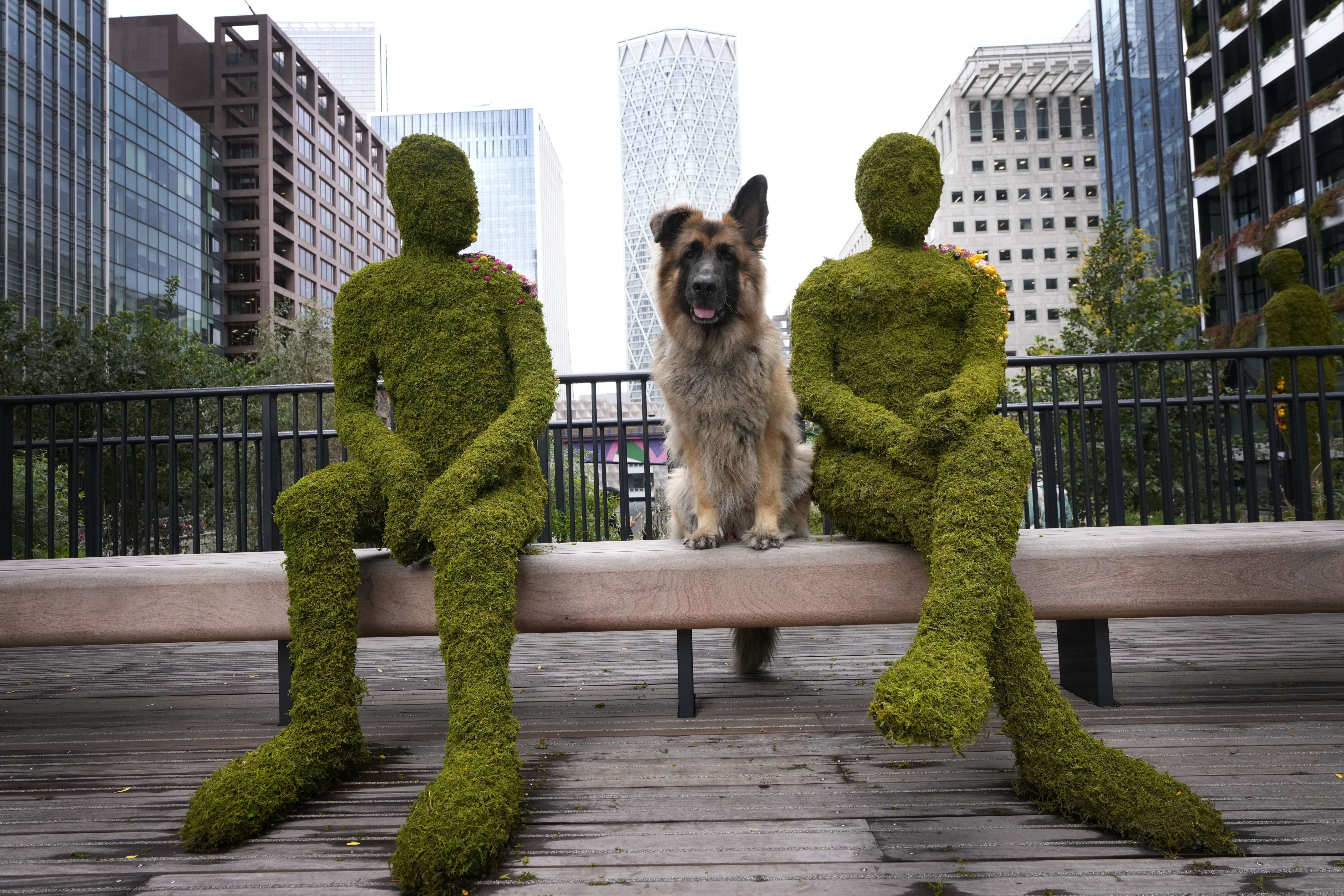 Jengo the dog sits with part of an installation called Eden Dock in London's Canary Wharf financial district, in partnership with the Eden Project, with the aim to improve the well-being of people who live, work or visit the area, Wednesday, October 2, 2024. (Phoot by Kirsty Wigglesworth/AP Photo)