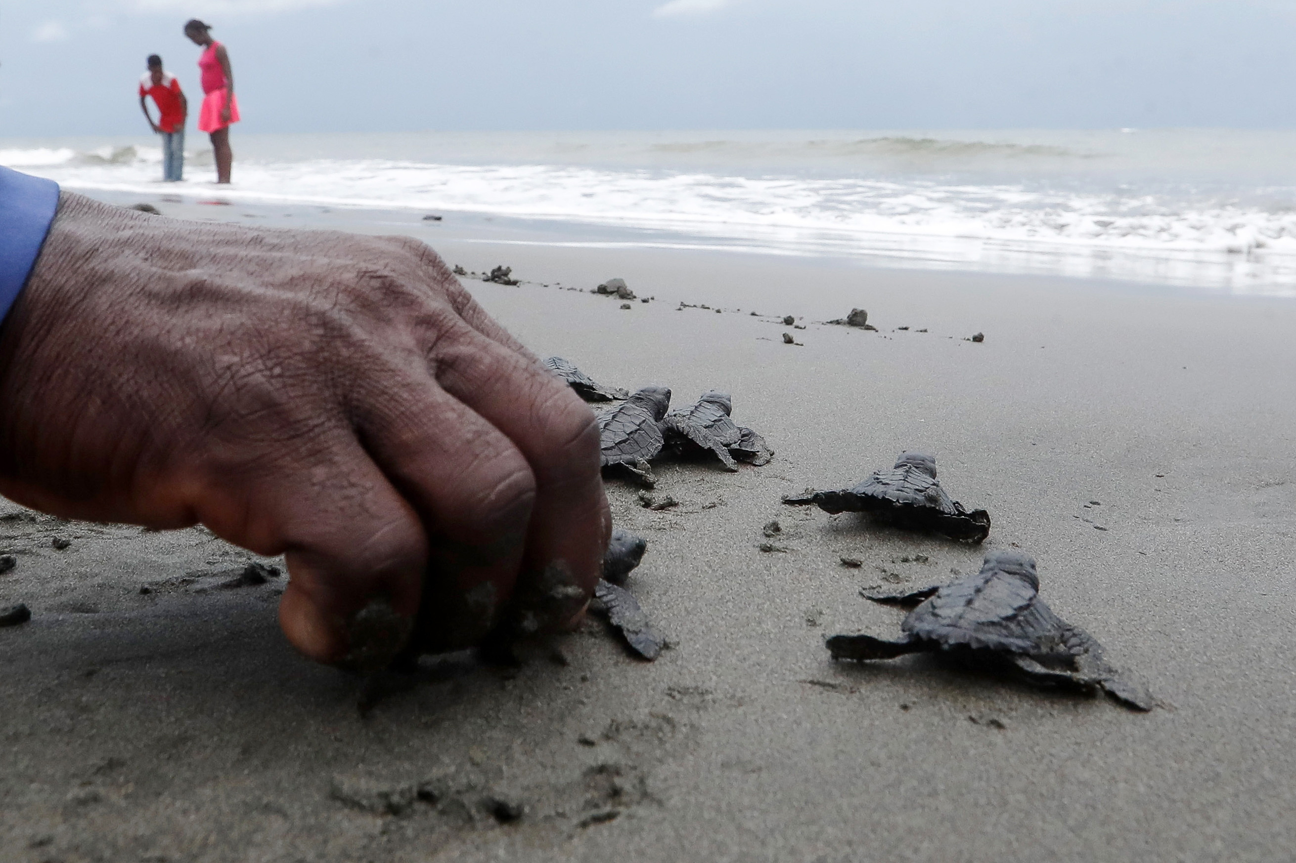 A man releases a baby sea turtle in Buenaventura, Colombia, 27 September 202. The Corporacion Autonoma Regional del Valle del Cauca (CVC) led together with the communities at the mouth of the Cajambre river, a day of releasing black olive ridley sea turtles. (Photo by Ernesto Guzman/EPA/EFE)