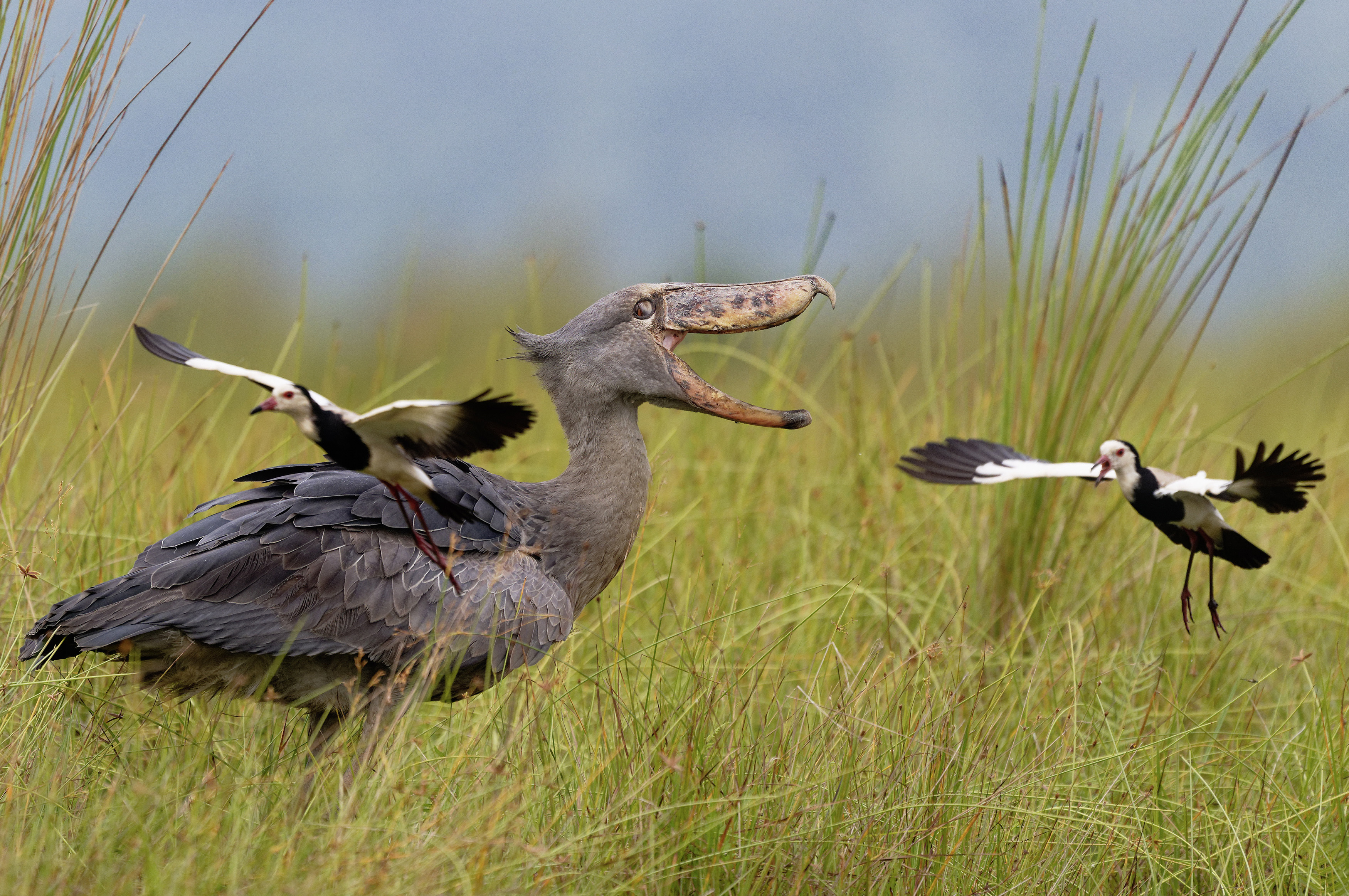 A shoebill frustrates a couple of lapwings by getting too close to their nest in the Mabamba swamp, Lake Victoria, Uganda in the second decade of September 2024. The majority of shoebills, estimated at between 5,000 and 8,000, live in swamps in South Sudan, Uganda, the eastern Democratic Republic of the Congo, and Zambia. (Photo by Patrick Kientz/Naturagency/Solent News)