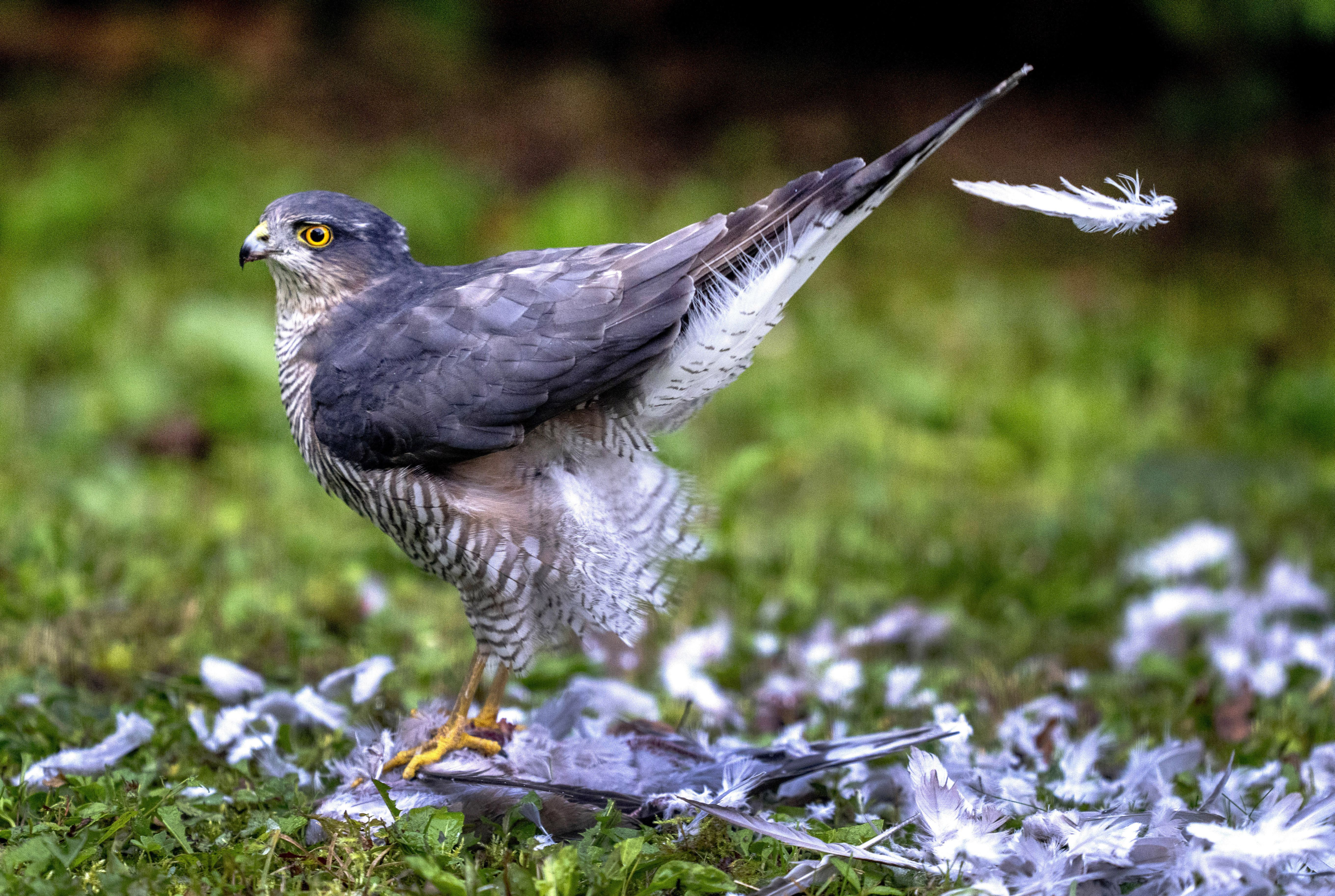 A raptor has killed a pigeon in a garden in Frankfurt, Germany, Saturday, September 21, 2024. (Photo by Michael Probst/AP Photo)