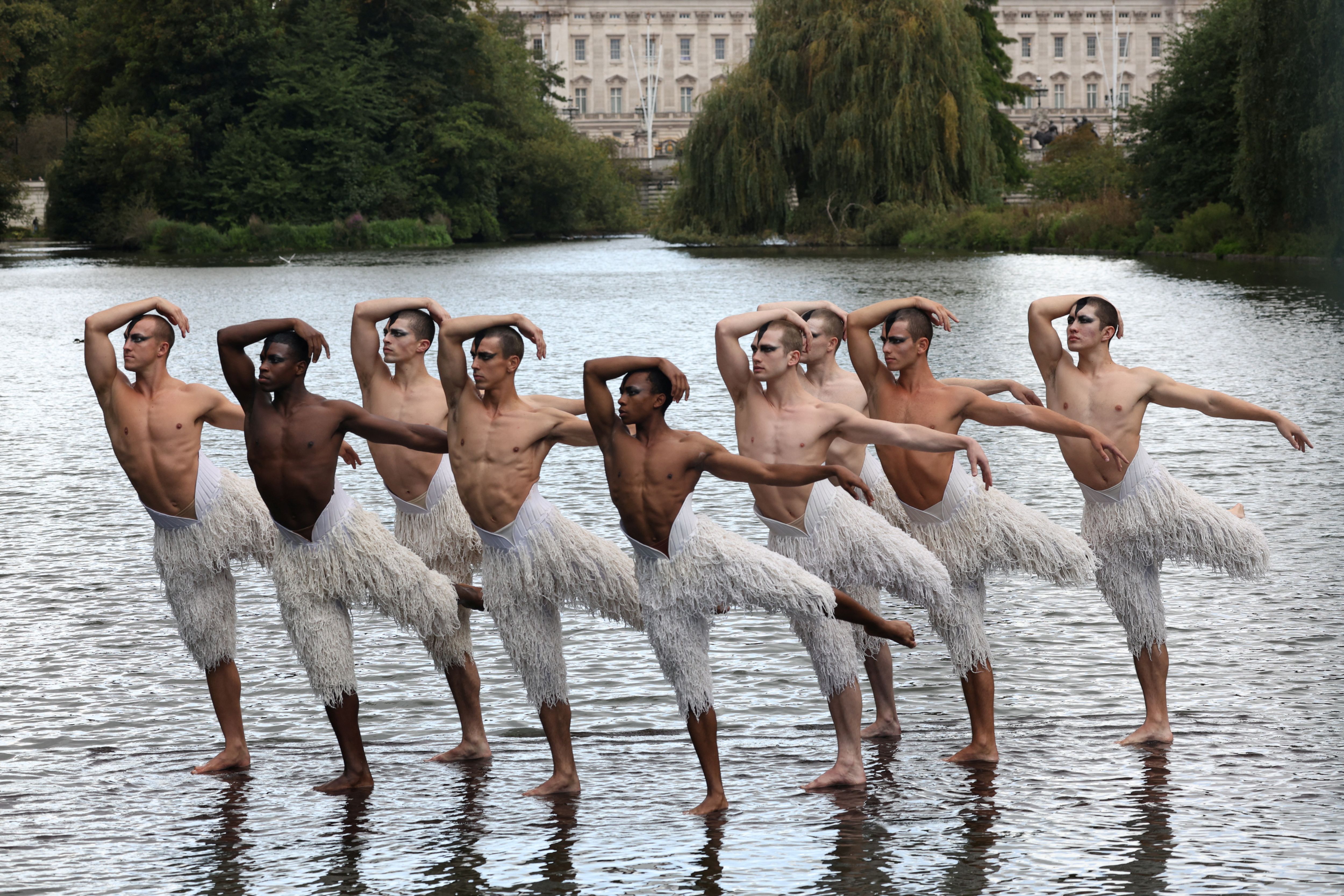 The cast of Matthew Bourne's Swan Lake pose for a photo in costume, on the lake in St James's Park, in London, Britain on September 11, 2024. (Photo by Mina Kim/Reuters)