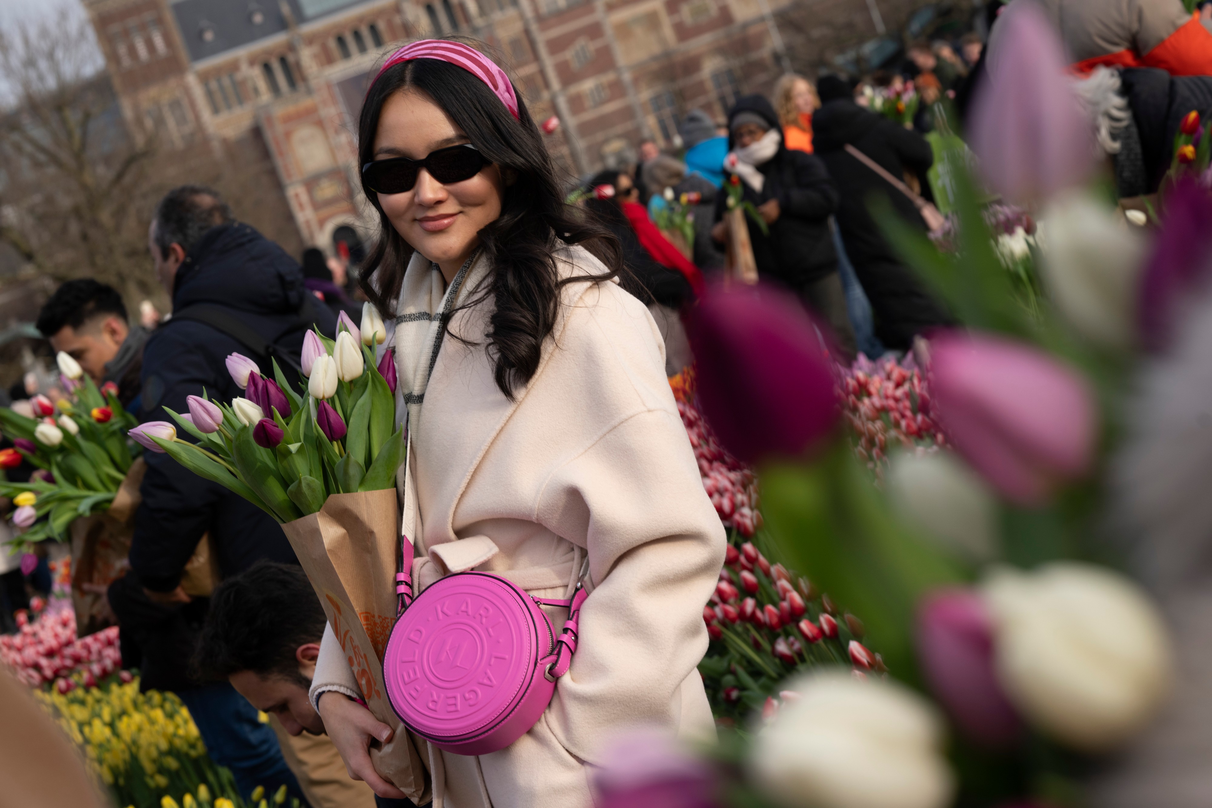 A woman poses for a picture as thousands of people picked free tulips on national tulip day which marked the opening of the 2024 tulip season on Museum Square in Amsterdam, Netherlands, Saturday, January 20, 2024. (Photo by Peter Dejong/AP Photo)