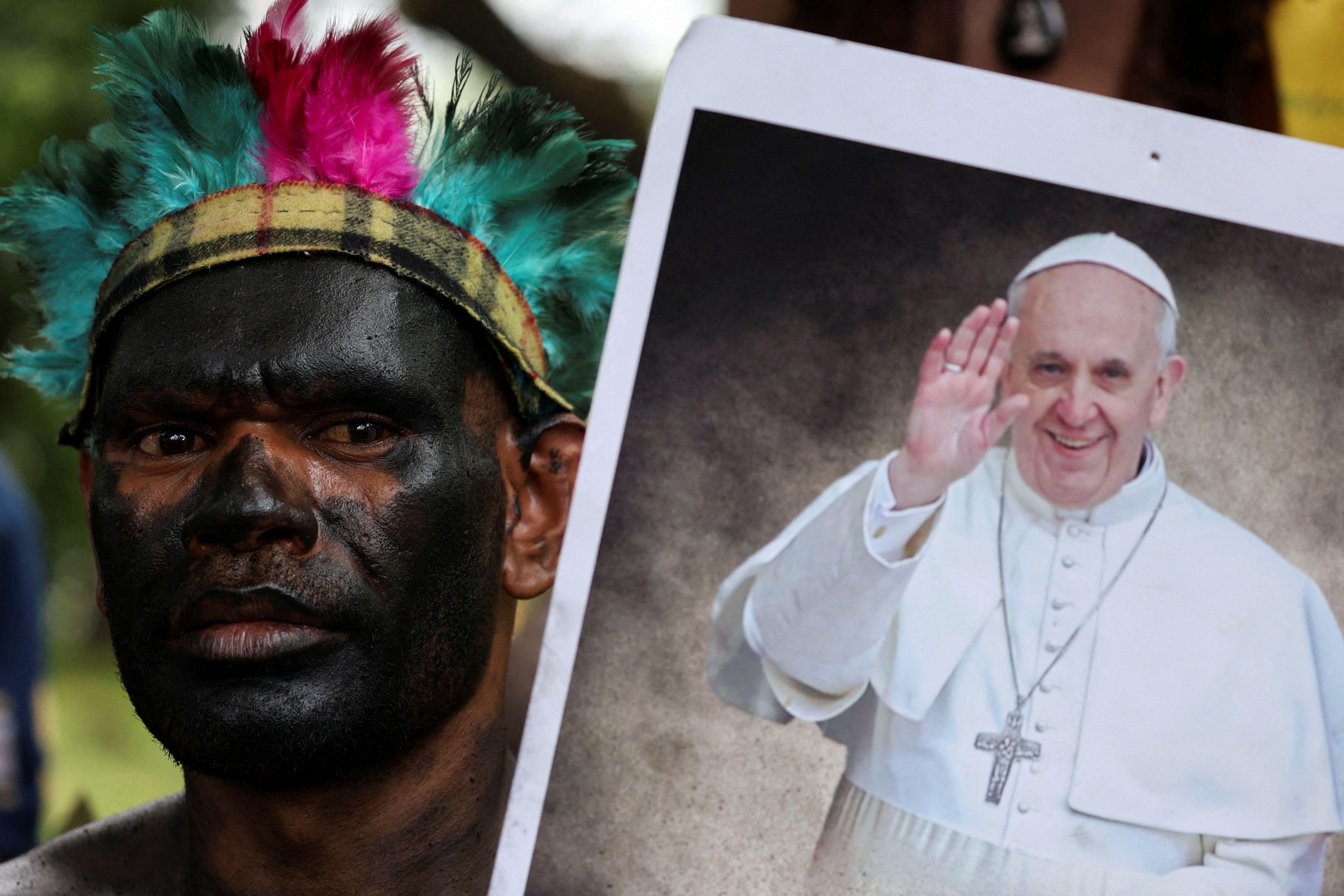 A Papuan Catholic youth holds a placard depicting Pope Francis as he takes part in a rally outside the Vatican embassy during Pope Francis's visit, in Jakarta, Indonesia on September 4, 2024. (Photo by Ajeng Dinar Ulfiana/Reuters)