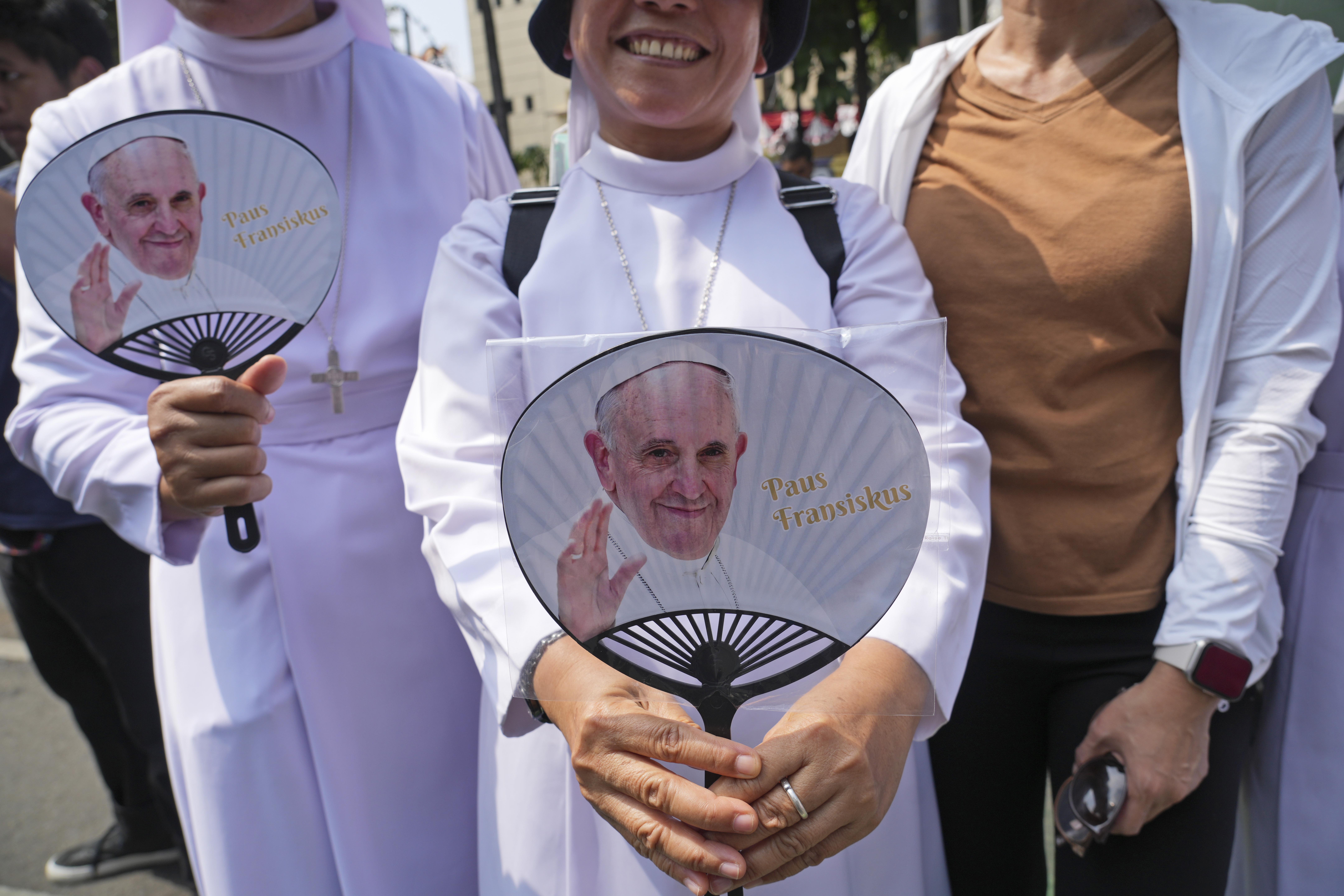 Devotees carrying hand fans printed with portraits of Pope Francis wait outside the Indonesian Bishops' Conference Headquarters to welcome the pope before his arrival for a meeting, in Jakarta, Indonesia, Thursday, September 5, 2024. (Photo by Tatan Syuflana/AP Photo)