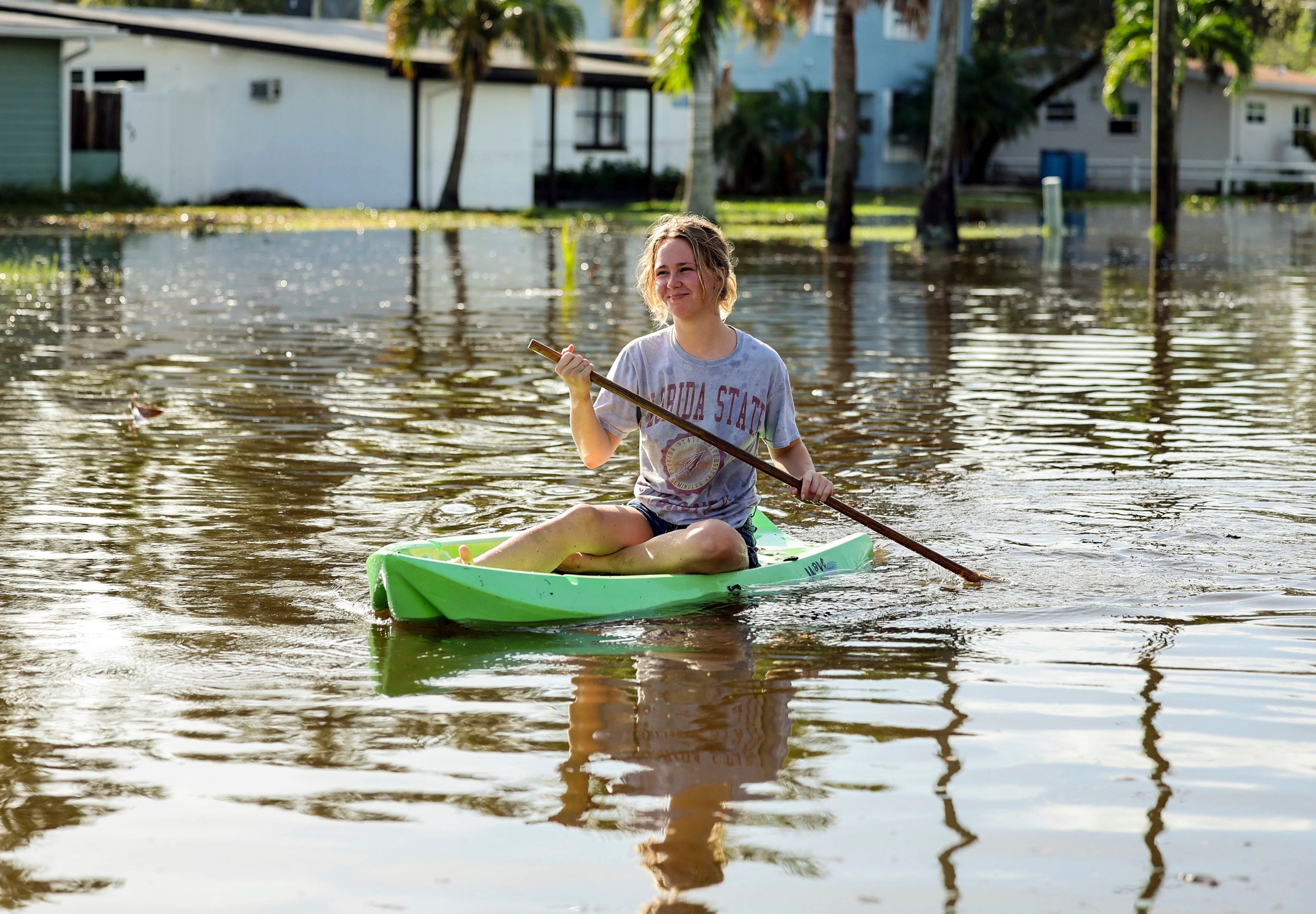 Halle Brooks kayaks down a street flooded by Hurricane Helene in the Shore Acres neighborhood Friday, September 27, 2024, in St. Petersburg, Fla. (Photo by Mike Carlson/AP Photo)