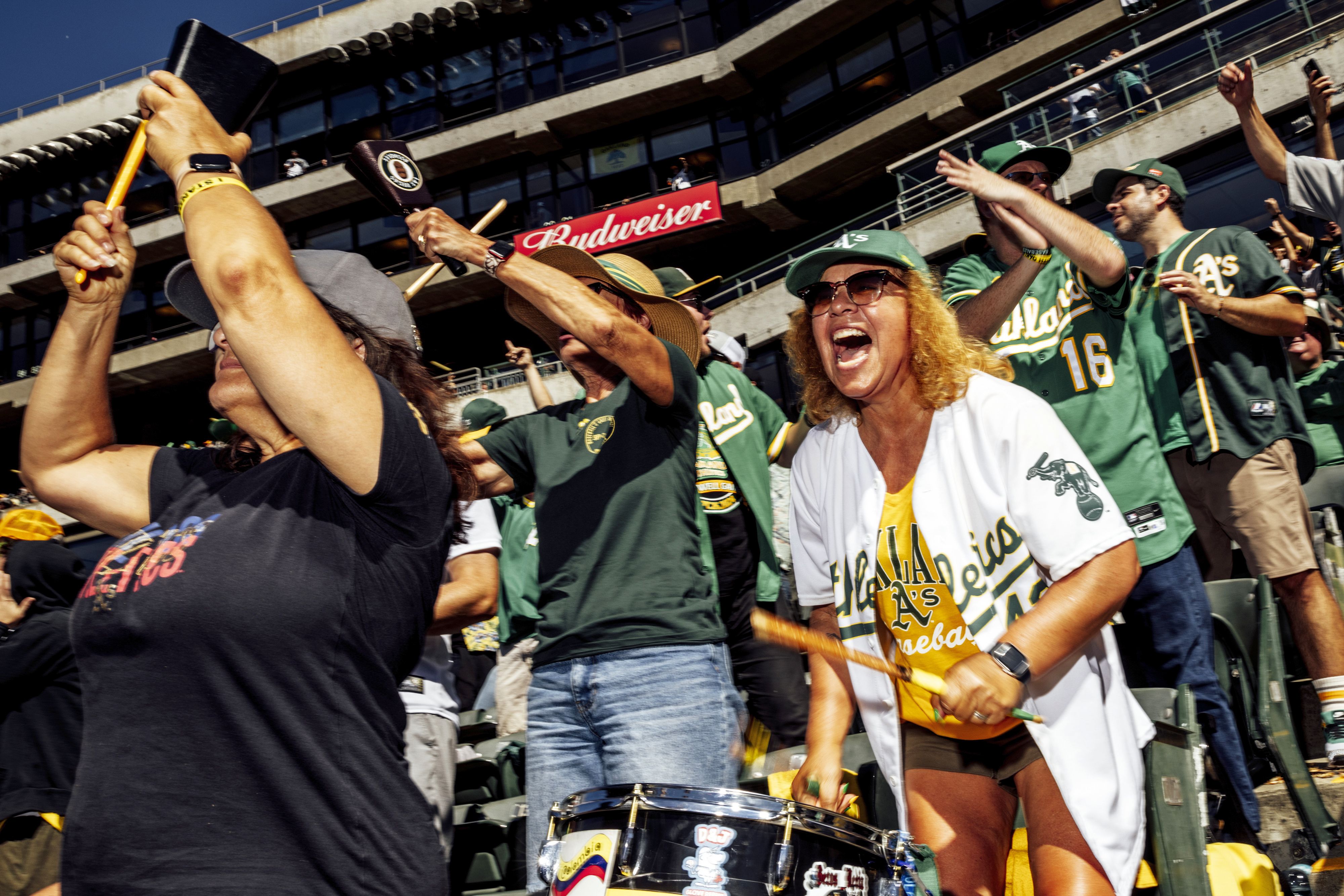 Esperanza Uruena, right, drums in reaction to a scoring play during the fifth inning of a baseball game between the Oakland Athletics and the Texas Rangers in Oakland, Calif., Thursday, September 26, 2024. (Photo by Stephen Lam/San Francisco Chronicle via AP Photo)