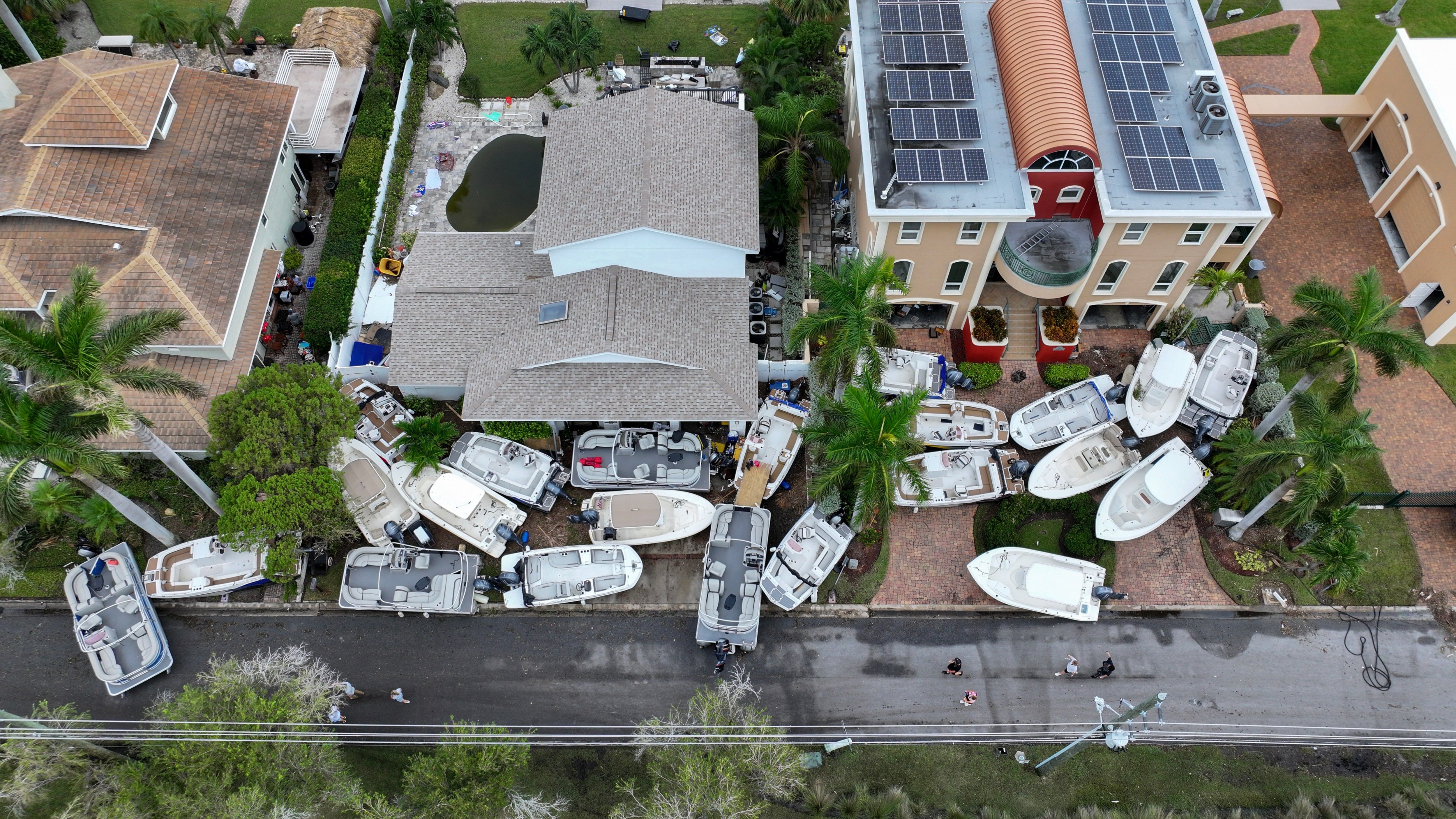 In this aerial view, boats are piled up in front of homes after Hurricane Helene hit the area as it passed offshore on September 28, 2024 in Treasure Island, Florida. Hurricane Helene made landfall Thursday night in Florida's Big Bend with winds up to 140 mph and storm surges that killed at least 42 people in several states. (Photo by Joe Raedle/Getty Images)