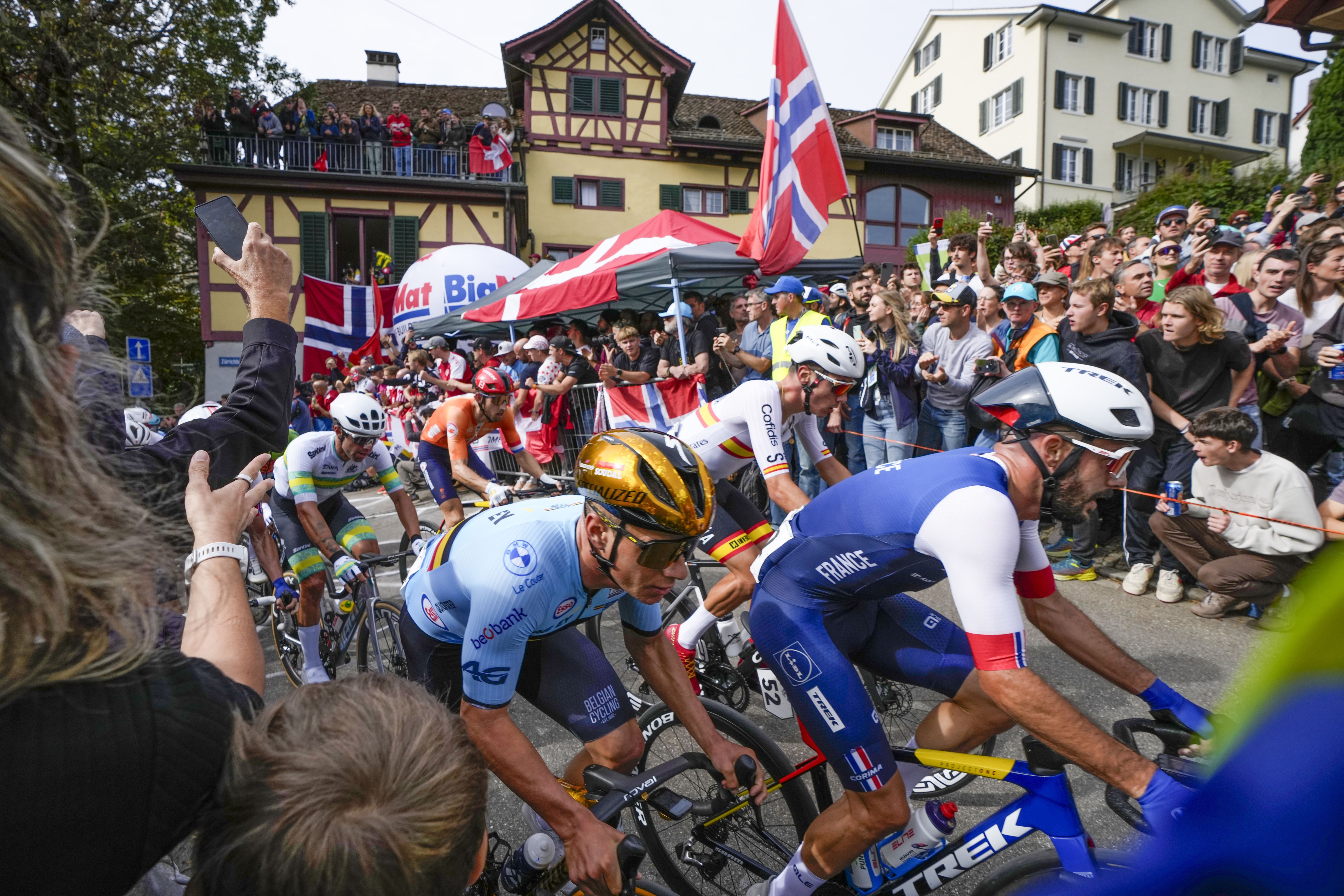 Belgium's Remco Evenepoel and France's Julien Bernard climb Zurichbergstrasse during the Men Elite road race of the Cycling and Para-cycling Road World Championships in Zurich, Switzerland, Sunday, September 29, 2024. (Photo by Peter Dejong/AP Photo)