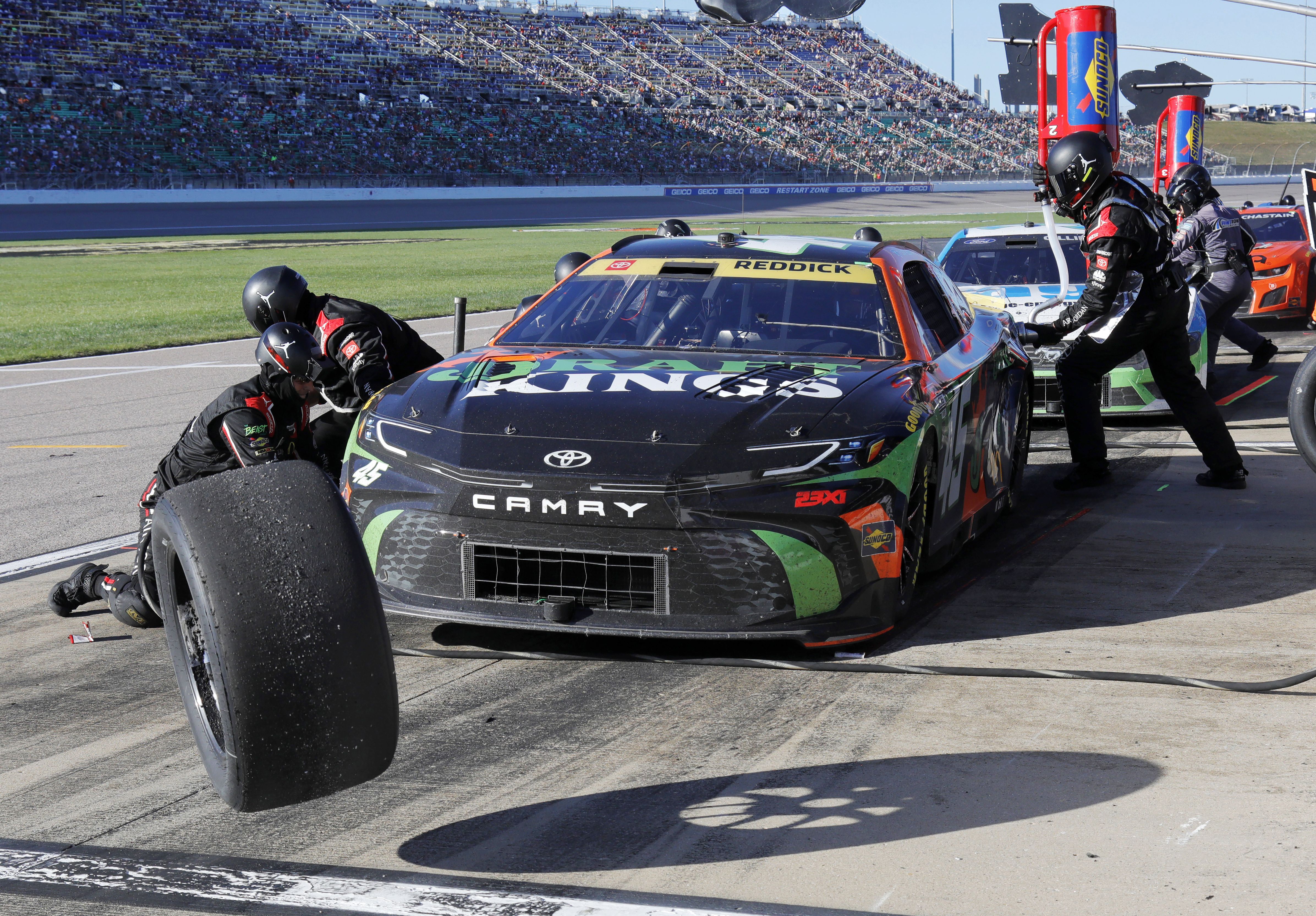 Tyler Reddick (45) has his tires changed on pit road during a NASCAR Cup Series auto race at Kansas Speedway in Kansas City, Kan., Sunday, September 29, 2024. (Photo by Colin E. Braley/AP Photo)