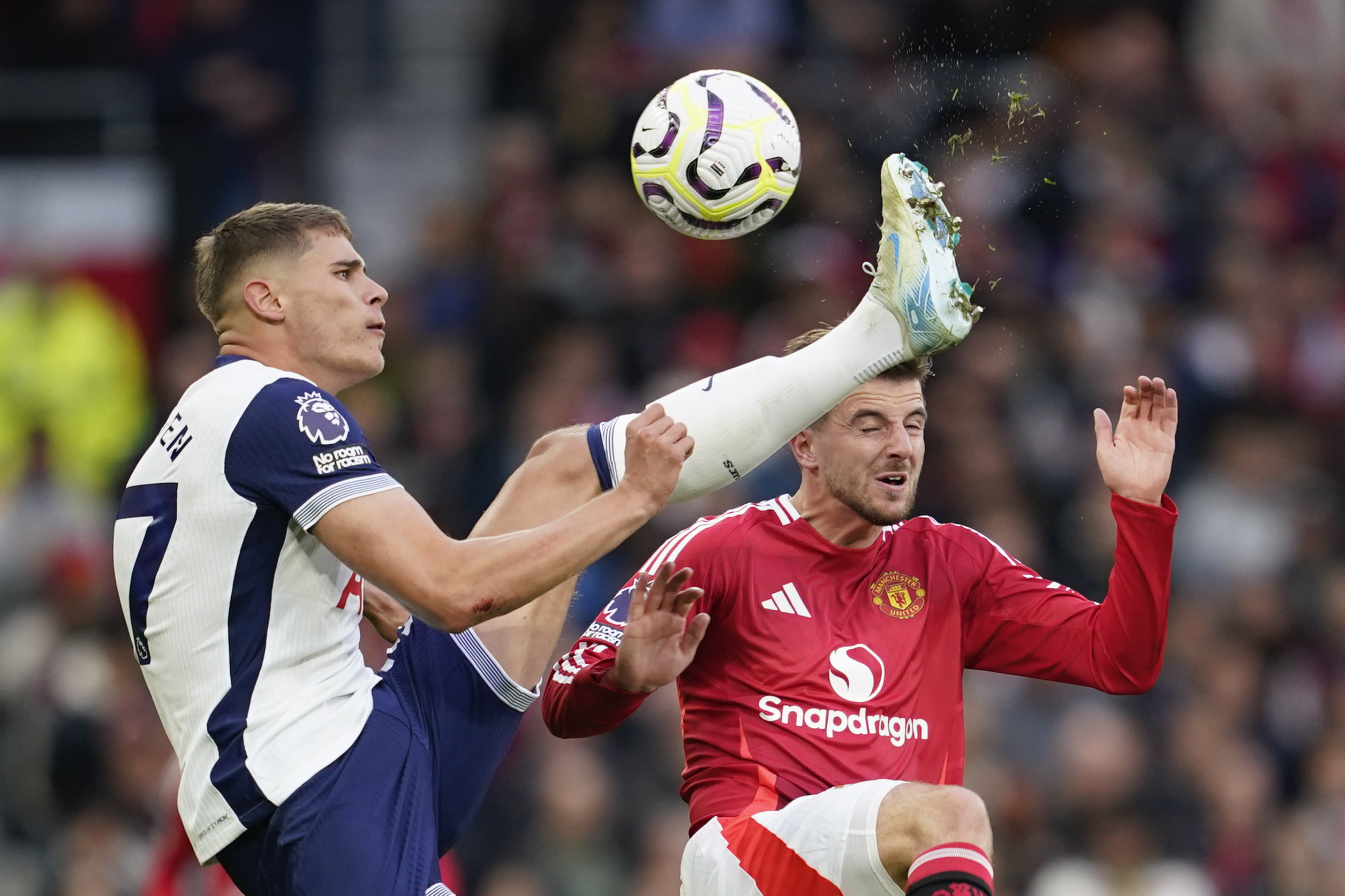 Tottenham's Micky van de Ven, left, challenges for the ball with Manchester United's Mason Mount during the English Premier League soccer match between Manchester United and Tottenham Hotspur at Old Trafford stadium in Manchester, England, Sunday, September 29, 2024. (Photo by Dave Thompson/AP Photo)