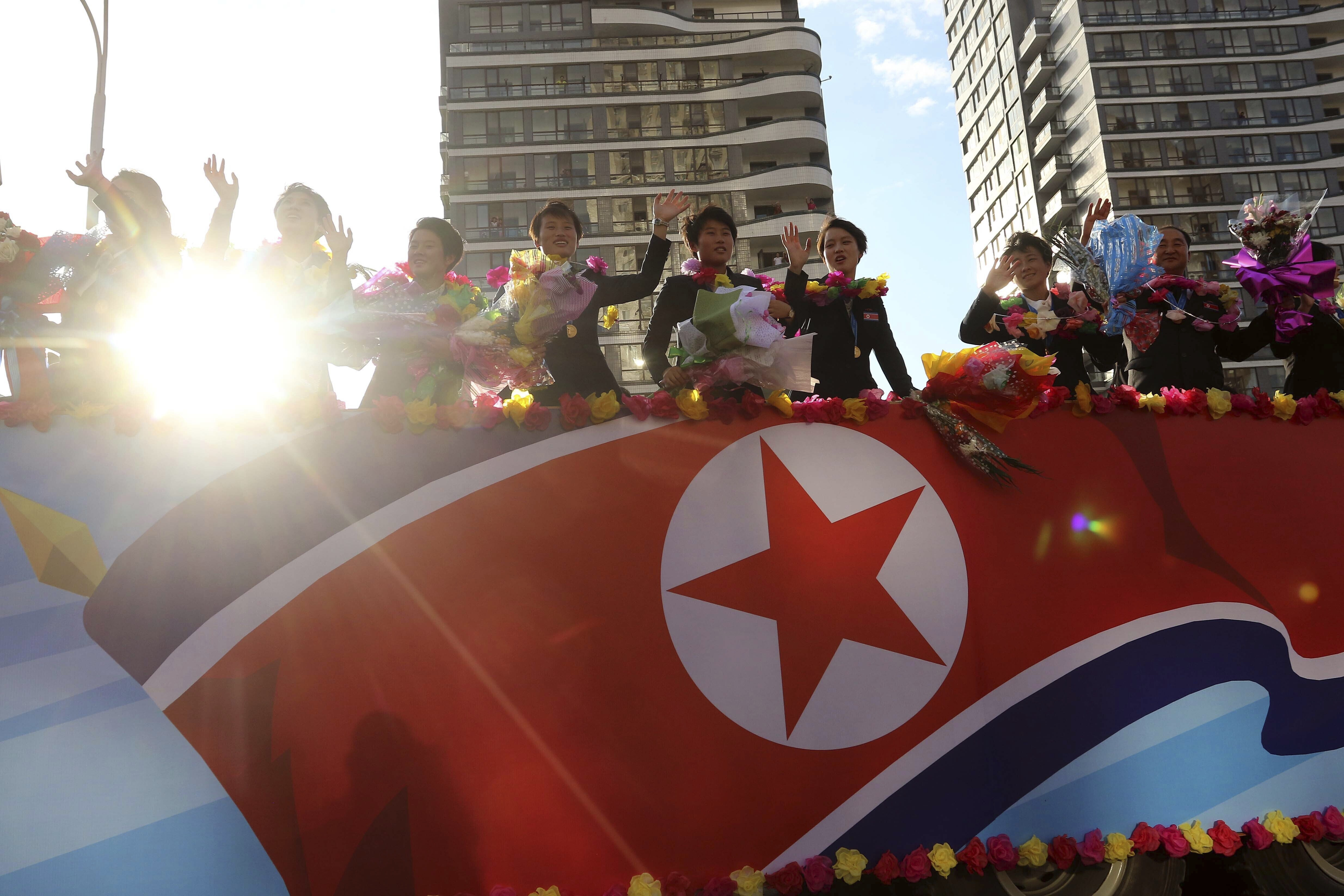 North Korea women's football team members wave to the crowd in Pyongyang, after they won the FIFA U-20 Women's World Cup held in Colombia, Saturday, September 28, 2024. (Photo by Jon Chol Jin/AP Photo)