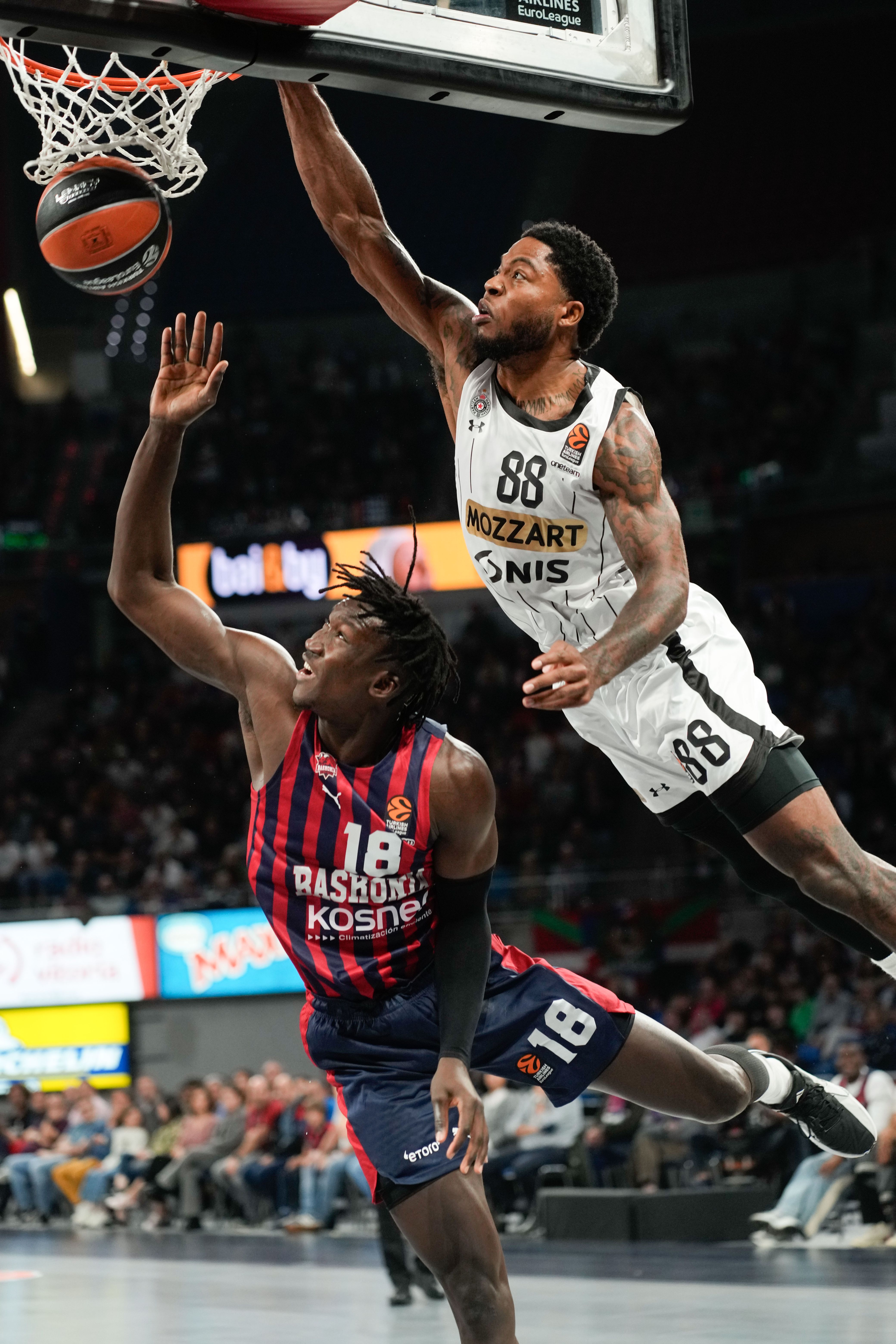 Partizan's Tyrique Jones (R) in action against Baskonia's Khalifa Diop (L) during the EuroLeague Basketball match between Baskonia Vitoria-Gasteiz and Partizan Belgrade, in Vitoria, Spain, 03 October 2024. (Photo by Adrian Ruiz Hierro/EPA/EFE)