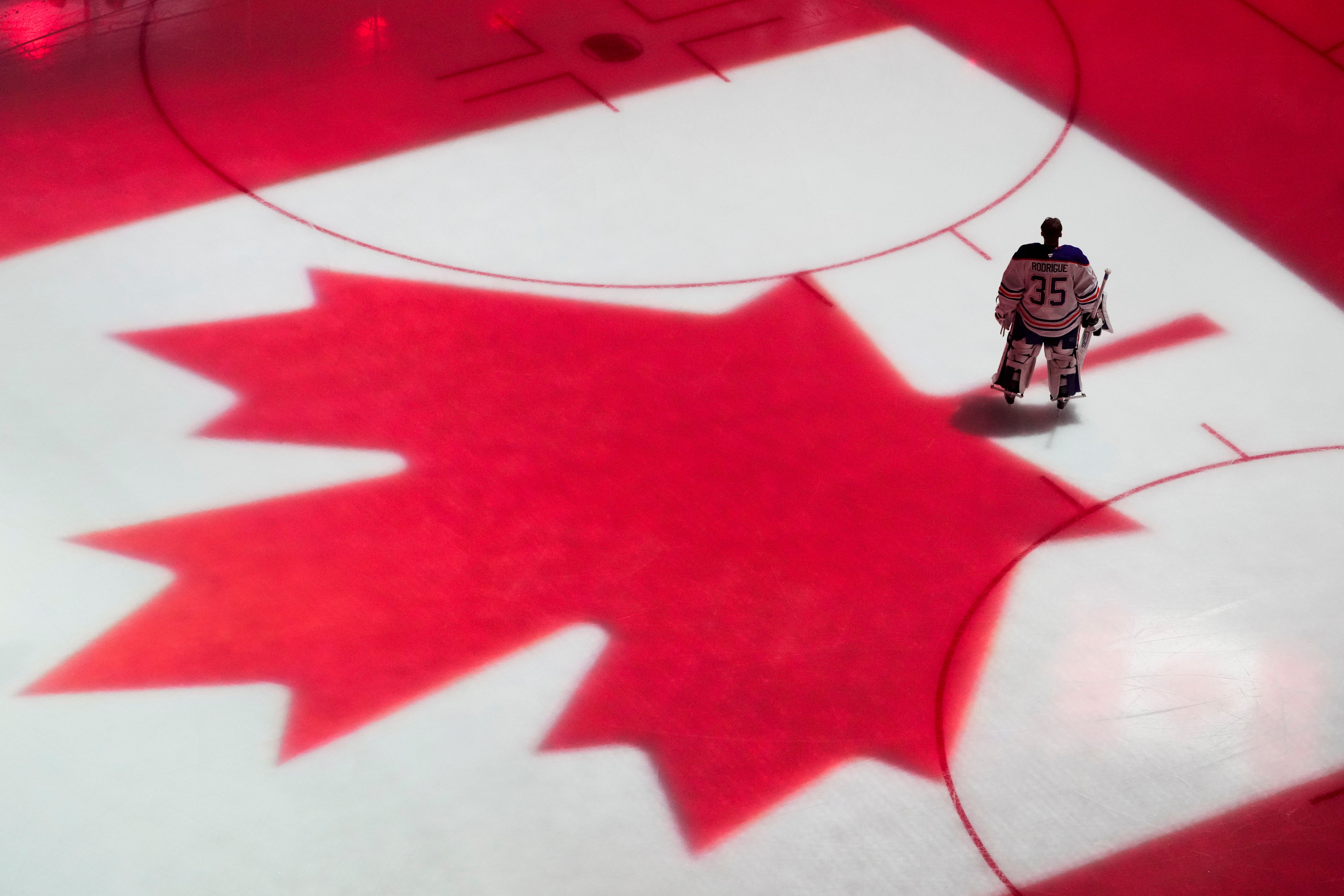 Edmonton Oilers goaltender Olivier Rodrigue stands on the ice as the flag of Canada is projected during the Canadian national anthem before a preseason NHL hockey game against the Seattle Kraken, Wednesday, October 2, 2024, in Seattle. (Photo by Lindsey Wasson/AP Photo)