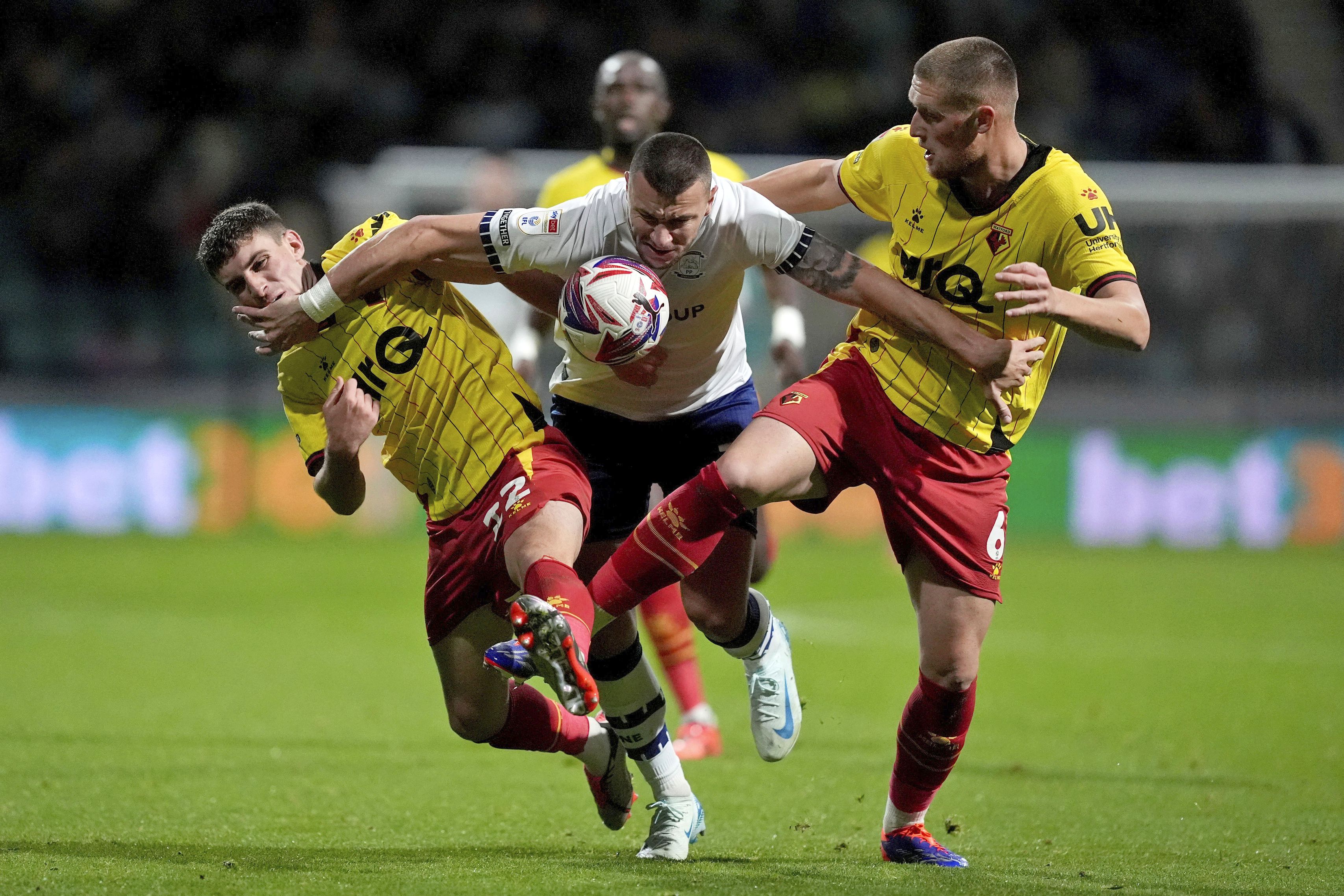 Preston North End's Milutin Osmajic, center, and Watford's Mattie Pollock, right, and James Morris battle for the ball during a Sky Bet Championship soccer match at Deepdale, Wednesday, October 2, 2024, in Preston, England. (Photo by Martin Rickett/PA Wire via AP Photo)