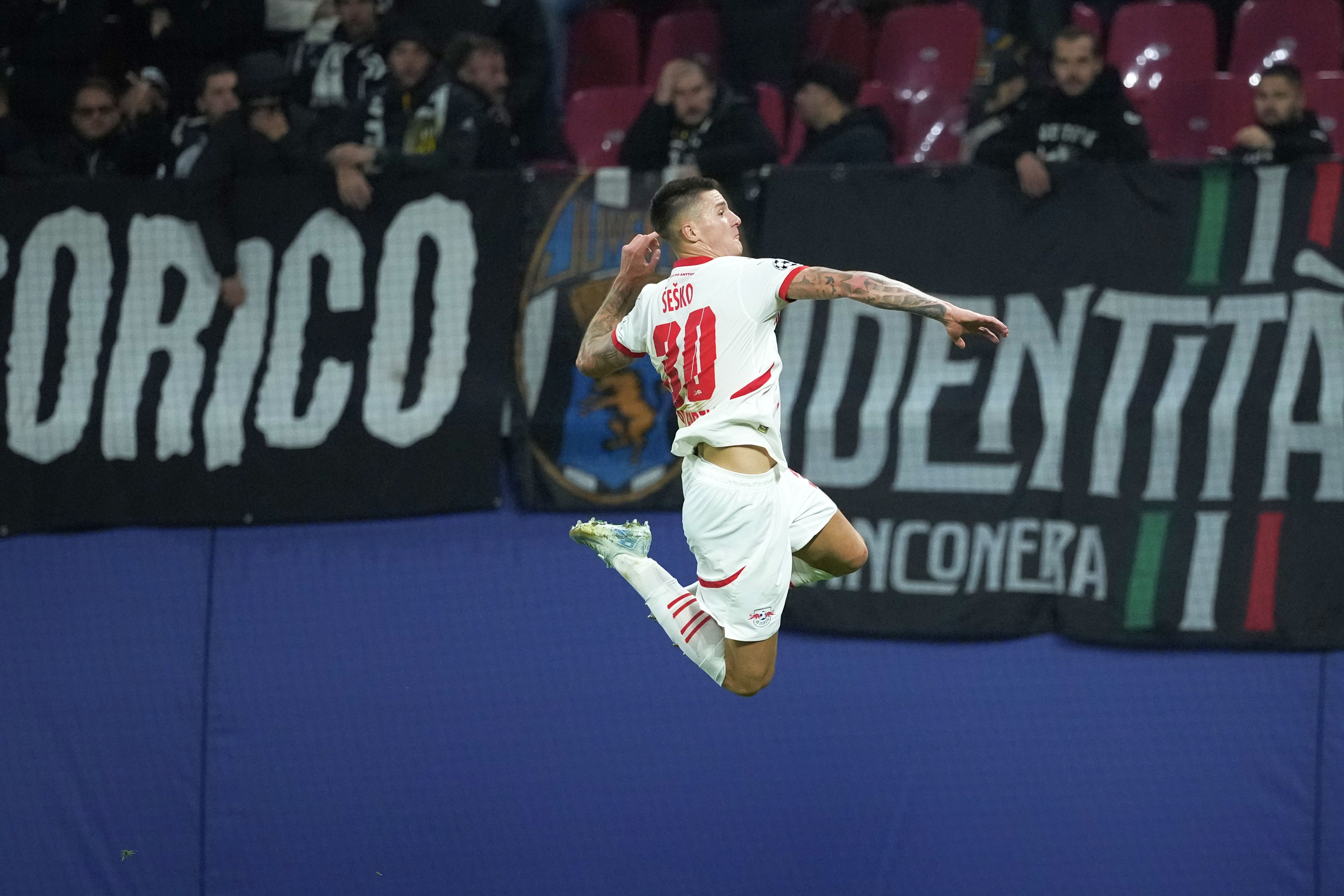 Leipzig's Benjamin Sesko celebrates after he scored during the UEFA Champions League opening phase soccer match between Leipzig and Juventus in Leipzig, Germany, Wednesday, October 2, 2024. (Photo by Ebrahim Noroozi/AP Photo)