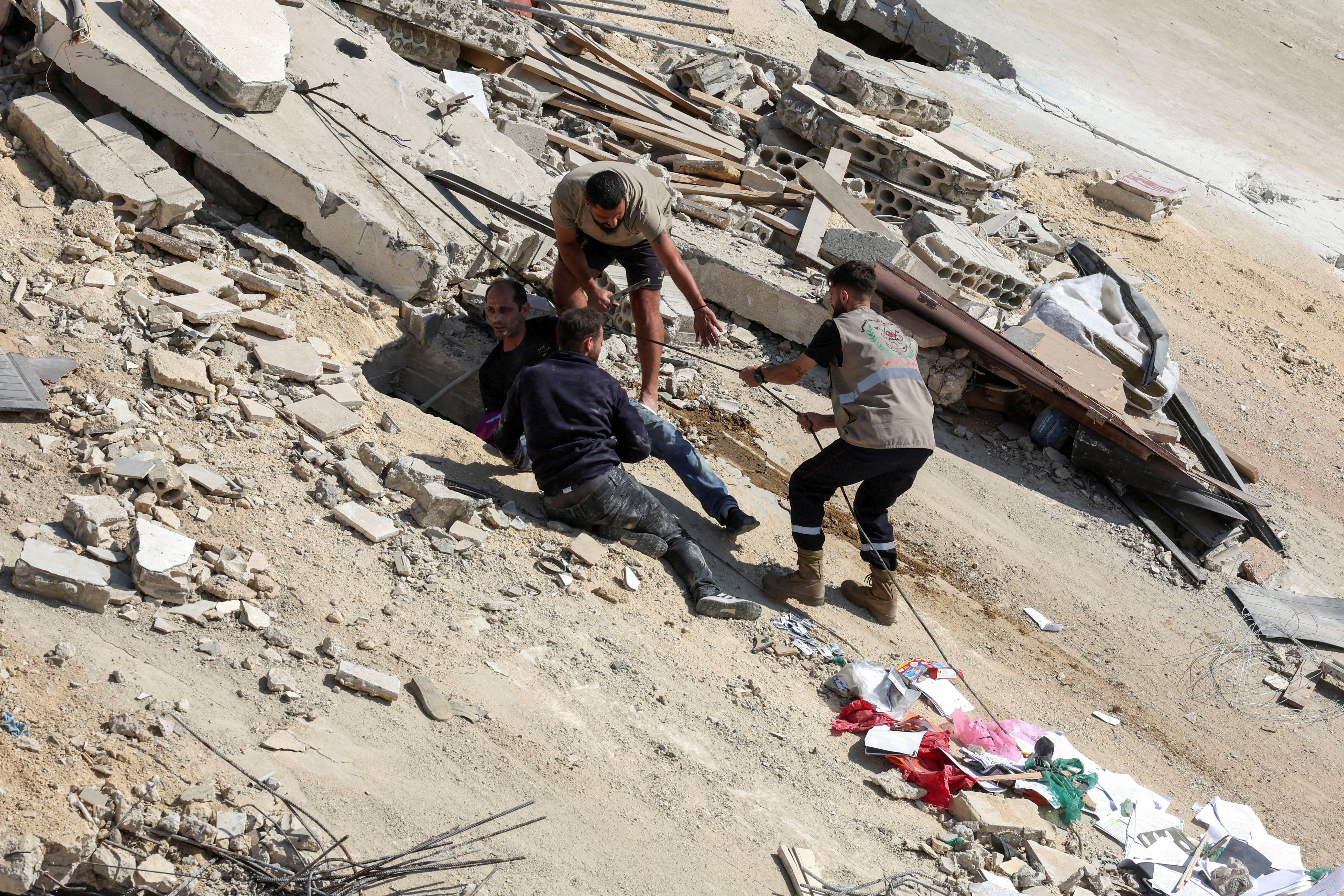 People carry out a rescue operation, at the site of Sunday's Israeli attack on the city of Ain Deleb, amid the ongoing hostilities between Hezbollah and Israeli forces, in southern Lebanon on September 30, 2024. (Photo by Aziz Taher/Reuters)