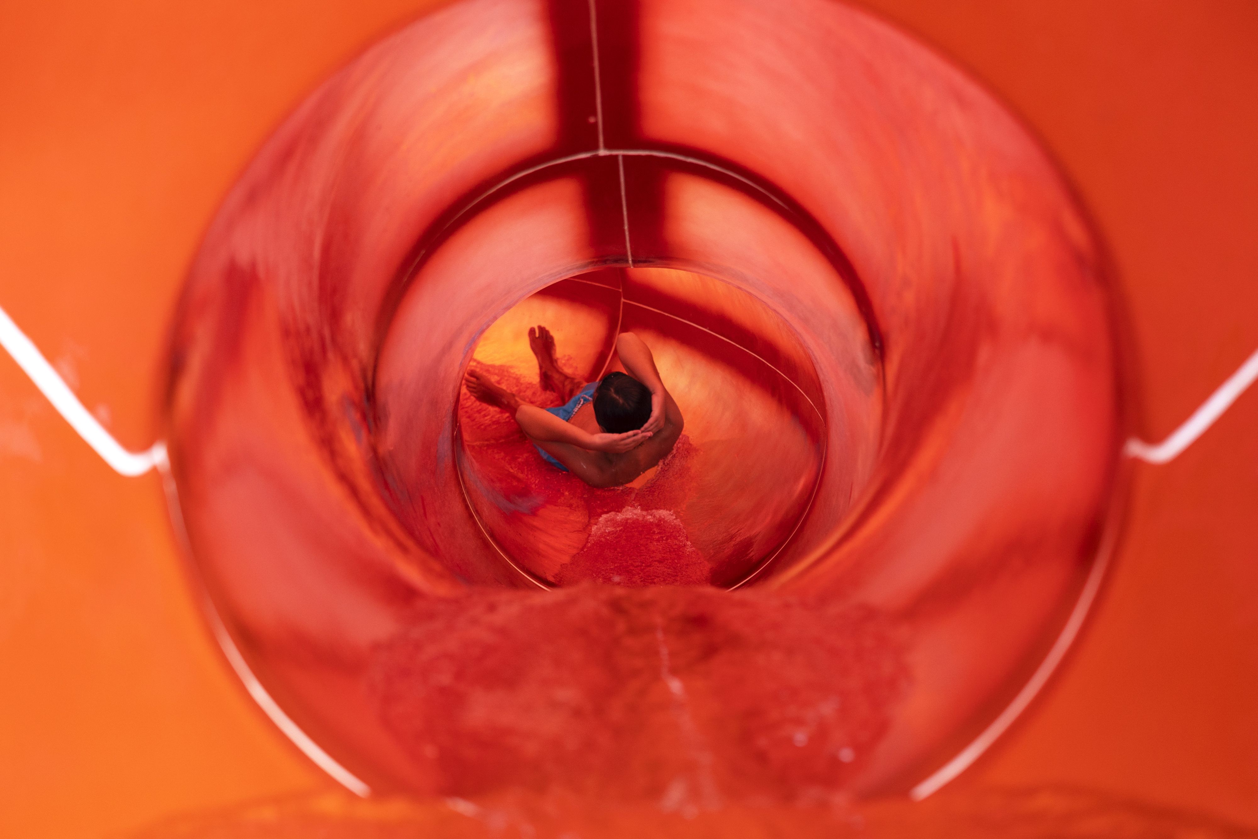 A youth enjoys a water slide at a water park of Spata town, east of Athens, Greece, Sunday, July 23, 2023. Heat in Greece is expected to grow worse during the weekend, approaching 44 Celsius (111 Fahrenheit) and the country will face one more heatwave episode by the end of July. (Photo by Yorgos Karahalis/AP Photo)