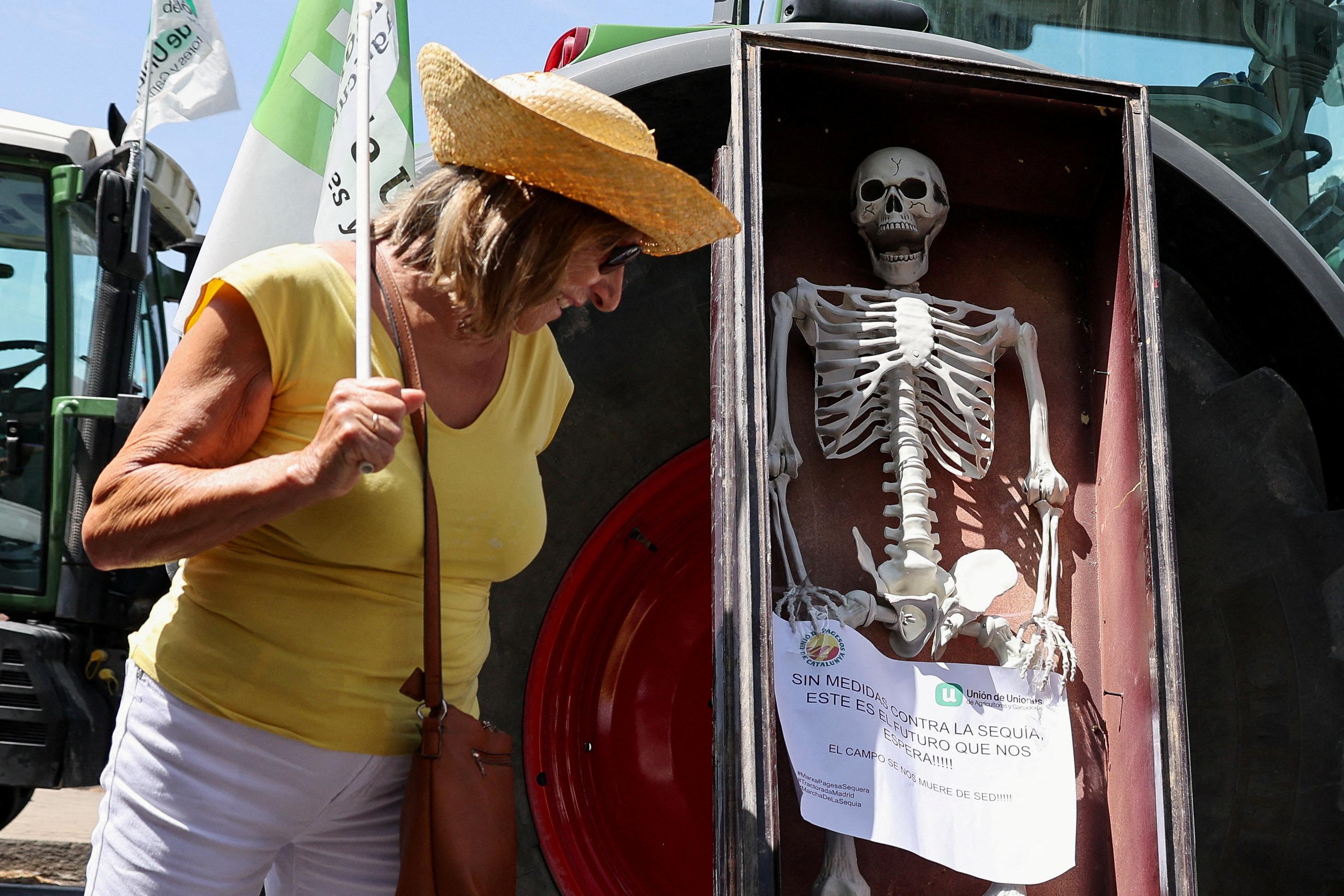 A woman looks at a paper and a skeleton figure which are placed next to a tractor as farmers protest over effects of drought and demand action from the government, in Madrid, Spain on July 5, 2023. (Photo by Violeta Santos Moura/Reuters)