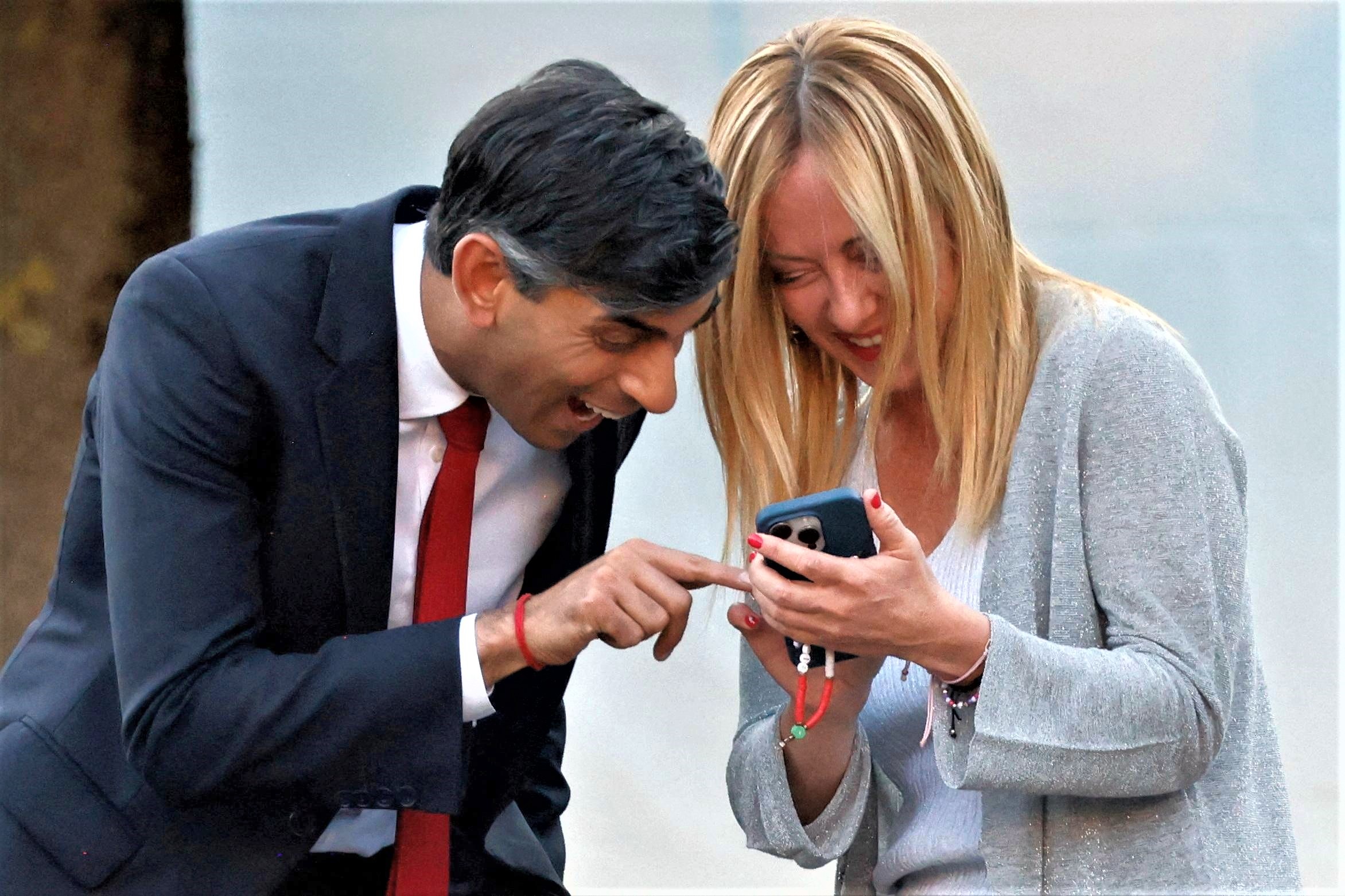 Britain's Prime Minister Rishi Sunak (L) and Italy's Prime Minister Giorgia Meloni react ahead of the social dinner during the NATO summit, at the Presidential Palace in Vilnius on July 11, 2023. NATO leaders will grapple with Ukraine's membership ambitions at their summit on July 11, 2023, their determination to face down Russia boosted by a breakthrough in Sweden's bid to join the alliance. (Photo by Ludovic Marin/Pool via AFP Photo)