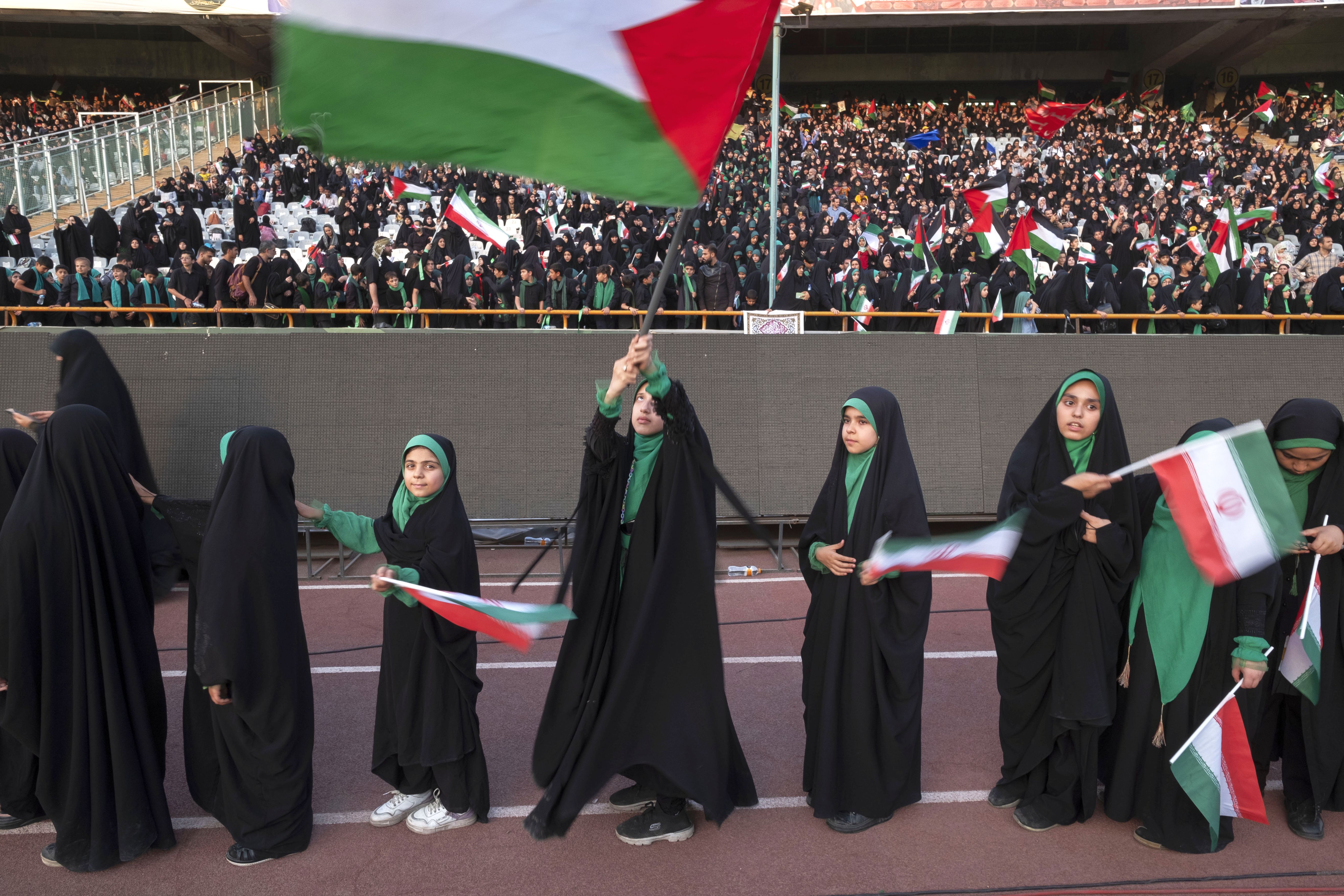 Young veiled schoolgirls are carrying Iranian flags as one of them is waving a Palestinian flag while participating in a gathering to support the mandatory hijab at the Azadi (Freedom) Stadium in western Tehran, Iran, on July 25, 2024. (Photo by Morteza Nikoubazl/NurPhoto/Rex Features/Shutterstock)