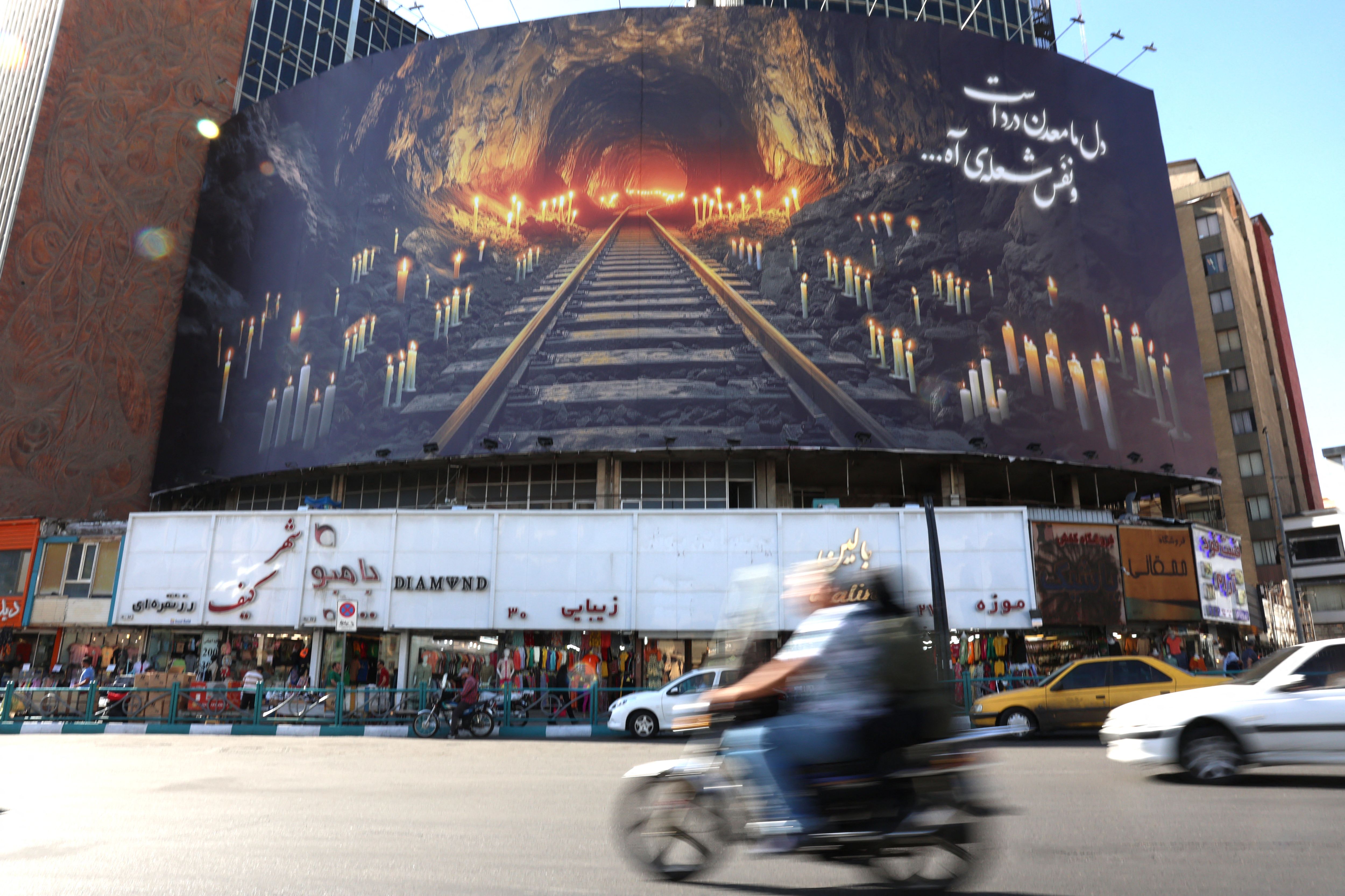 A banner honouring those killed in the blast caused by a gas leak at a coal mine at the Tabas mine in eastern Iran, is erected over a street in the capital Tehran on September 23, 2024. A blast caused by a gas leak at a coal mine has killed at least 51 people, state media said on September 22, in one of Iran's deadliest work accidents in years. (Photo by Atta Kenare/AFP Photo)