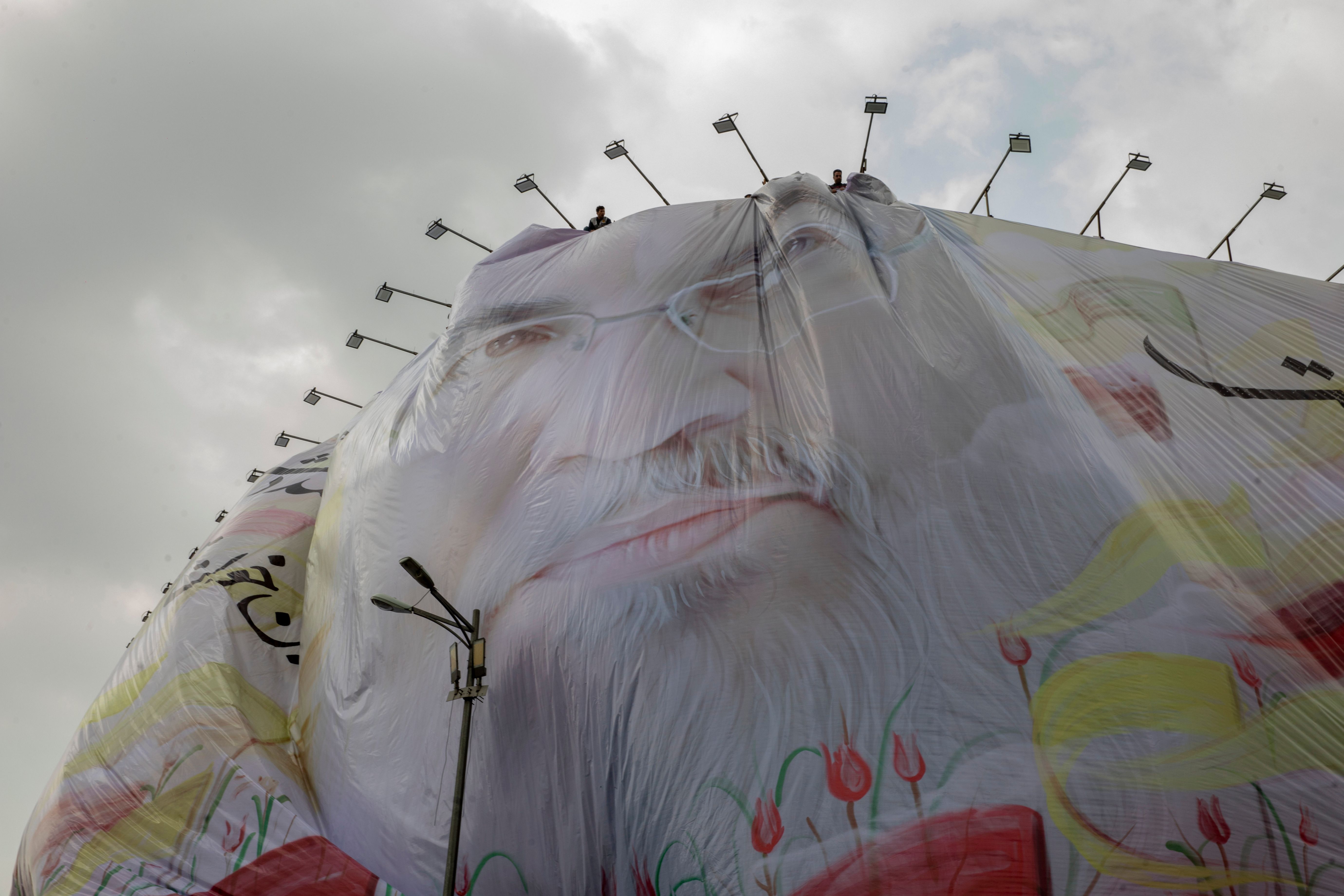 Workers are installing a big banner depicting Hassan Nasrallah, the slain leader of Lebanon's Hezbollah, in central Tehran, two days after his targeted assassination by Israeli forces in the southern suburbs of Beirut, on September 29, 2024 in Tehran, Iran. Iran's Supreme Leader vowed that Israel's killing of Hassan Nasrallah, the longtime leader of the Iran-backed Lebanese militant group Hezbollah, would be avenged. Iran declared five days of mourning after confirmation of his death in an airstrike on Beirut on Sept. 27. (Photo by Majid Saeedi/Getty Images)