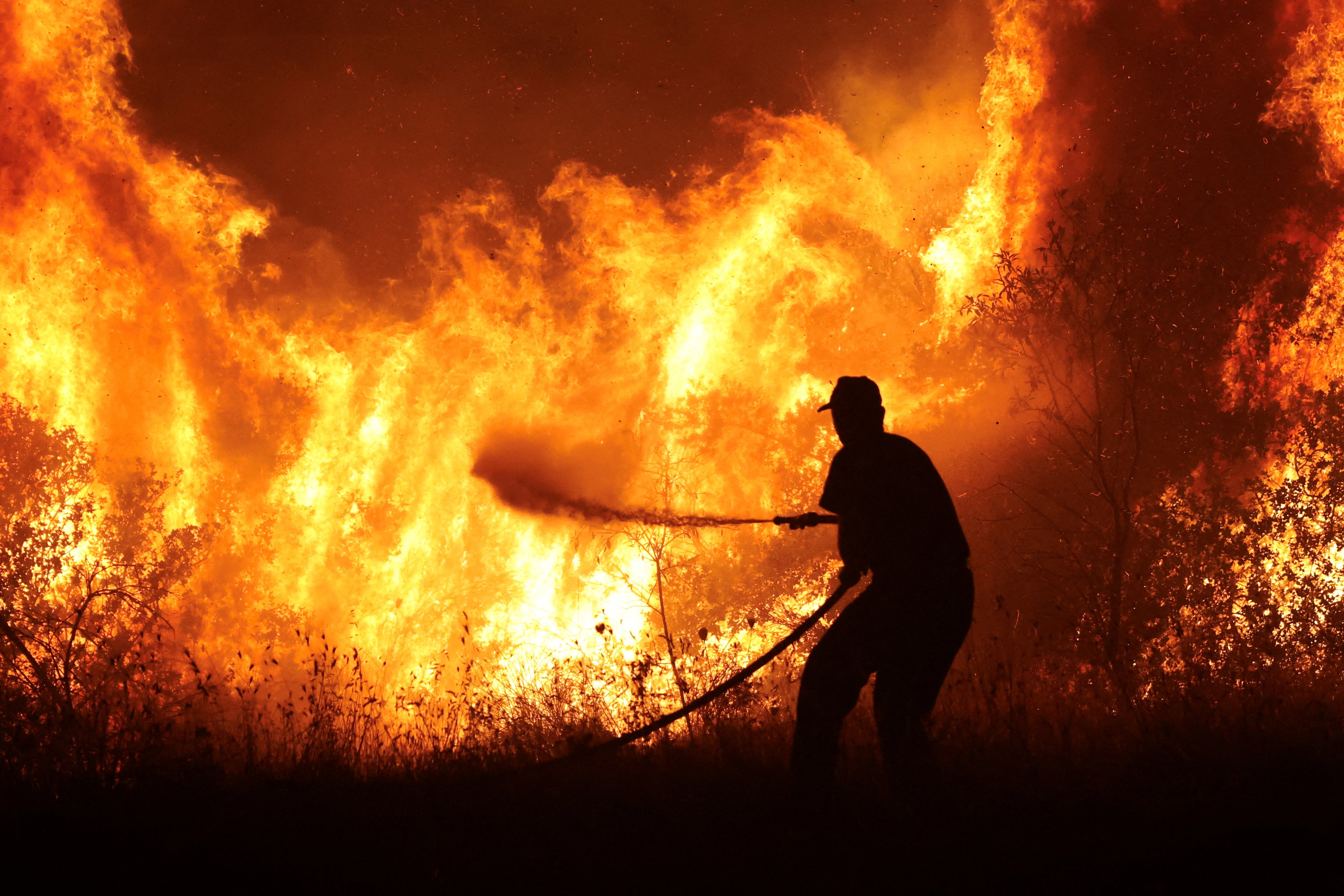 A firefighter tries to extinguish a wildfire burning at the industrial zone of the city of Volos, in central Greece on July 26, 2023. (Photo by Alexandros Avramidis/Reuters)
