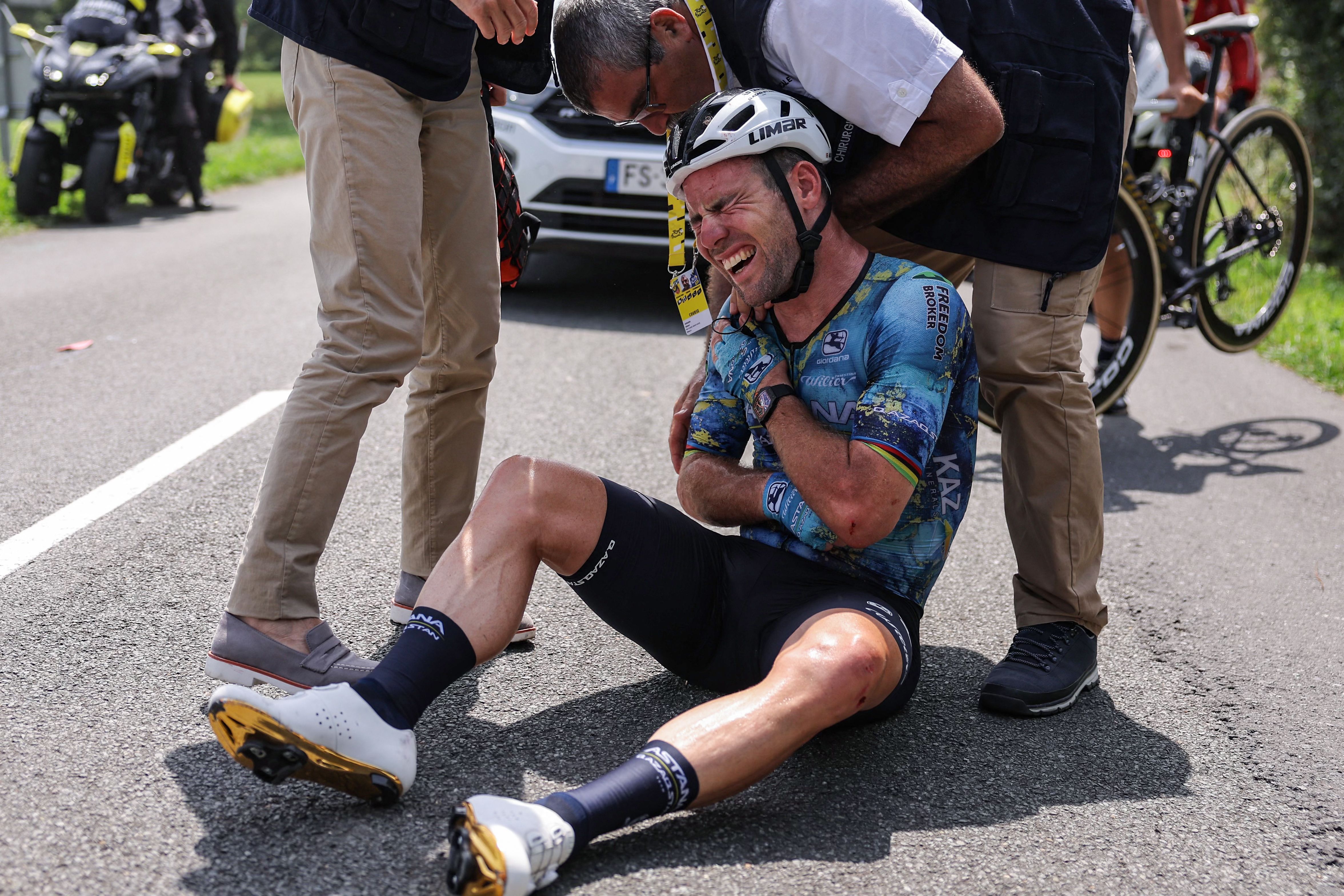 Astana Qazaqstan Team's British rider Mark Cavendish receives medical attention after suffering a crash during the 8th stage of the 110th edition of the Tour de France cycling race, 201 km between Libourne and Limoges, in central western France, on July 8, 2023. Mark Cavendish crashed out of the Tour de France on June 8, 2023 after a fall 140km into stage eight left the star British cyclist with what appeared to be a broken collarbone. (Photo by Thomas Samson/AFP Photo)