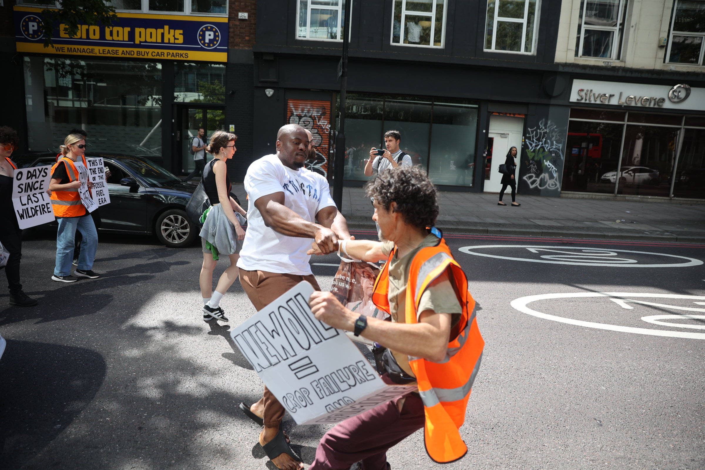 A man confronts activists from Just Stop Oil who block traffic on Marylebone Road in central London on July 17, 2023. Protesters from the group, an offshoot of Extinction Rebellion, have blocked roads, bridges and major events in the capital in order to highlight their demand that the government stop new oil and gas projects. (Photo by Marcin Nowak/London News Pictures)