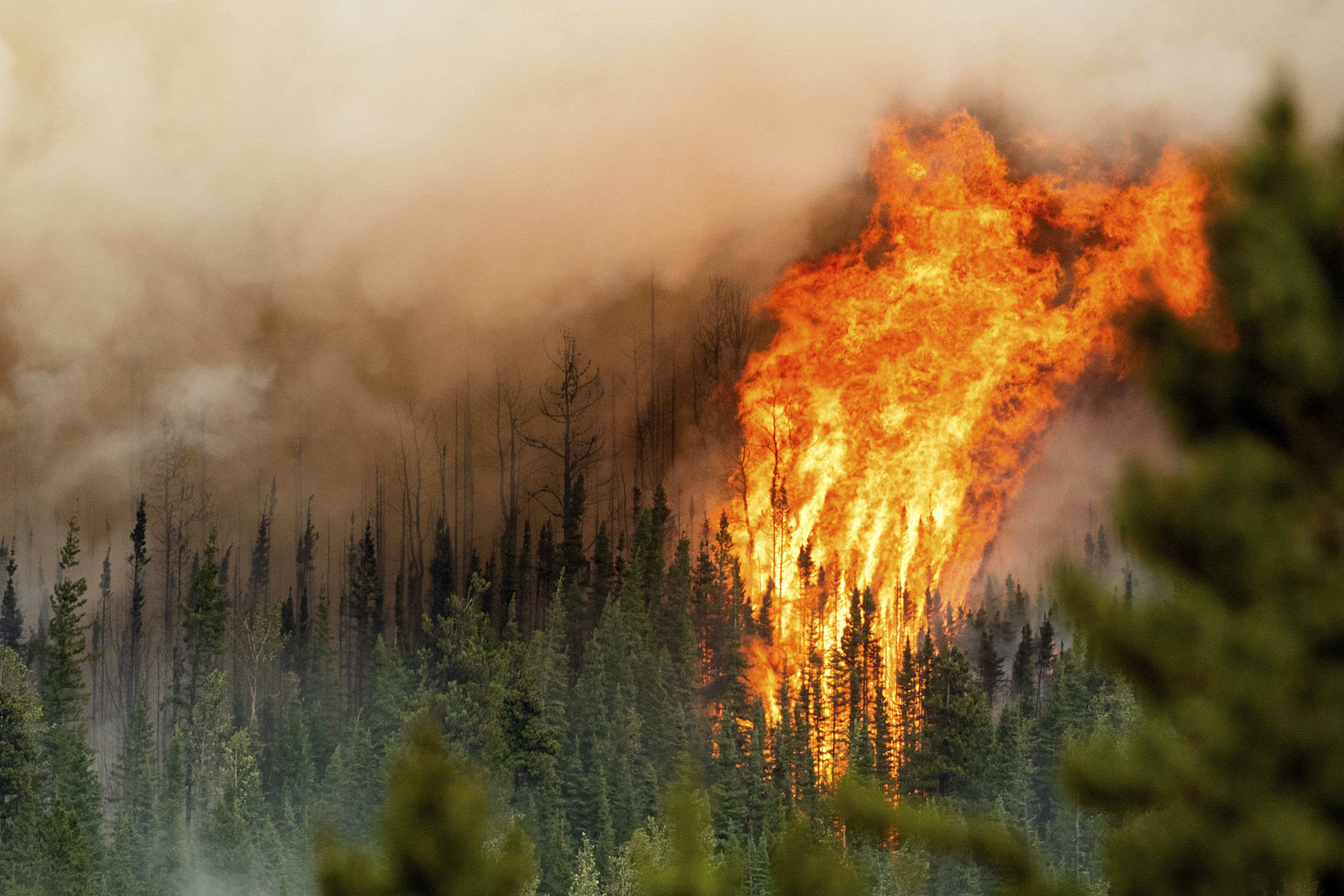 Flames from the Donnie Creek wildfire burn along a ridge top north of Fort St. John, British Columbia, Sunday, July 2, 2023. (Photo by Noah Berger/AP Photo)