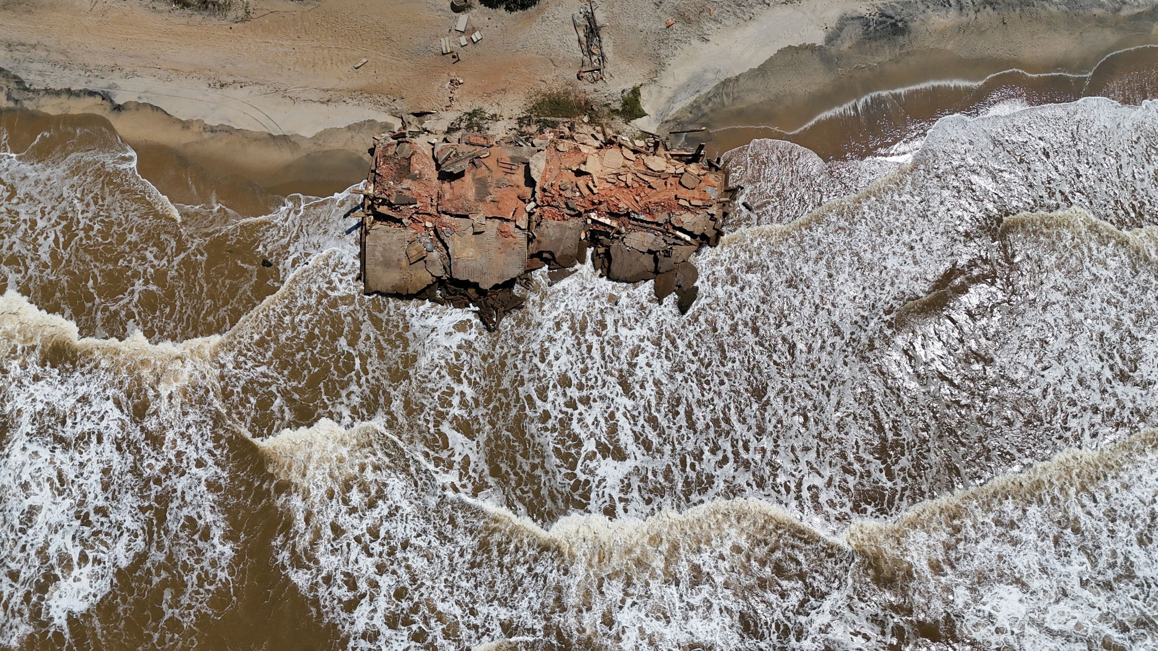 A drone view shows the remains of a destroyed house on the beach in Atafona, Rio de Janeiro state, Brazil, on September 16, 2024. (Photo by Ricardo Moraes/Reuters)