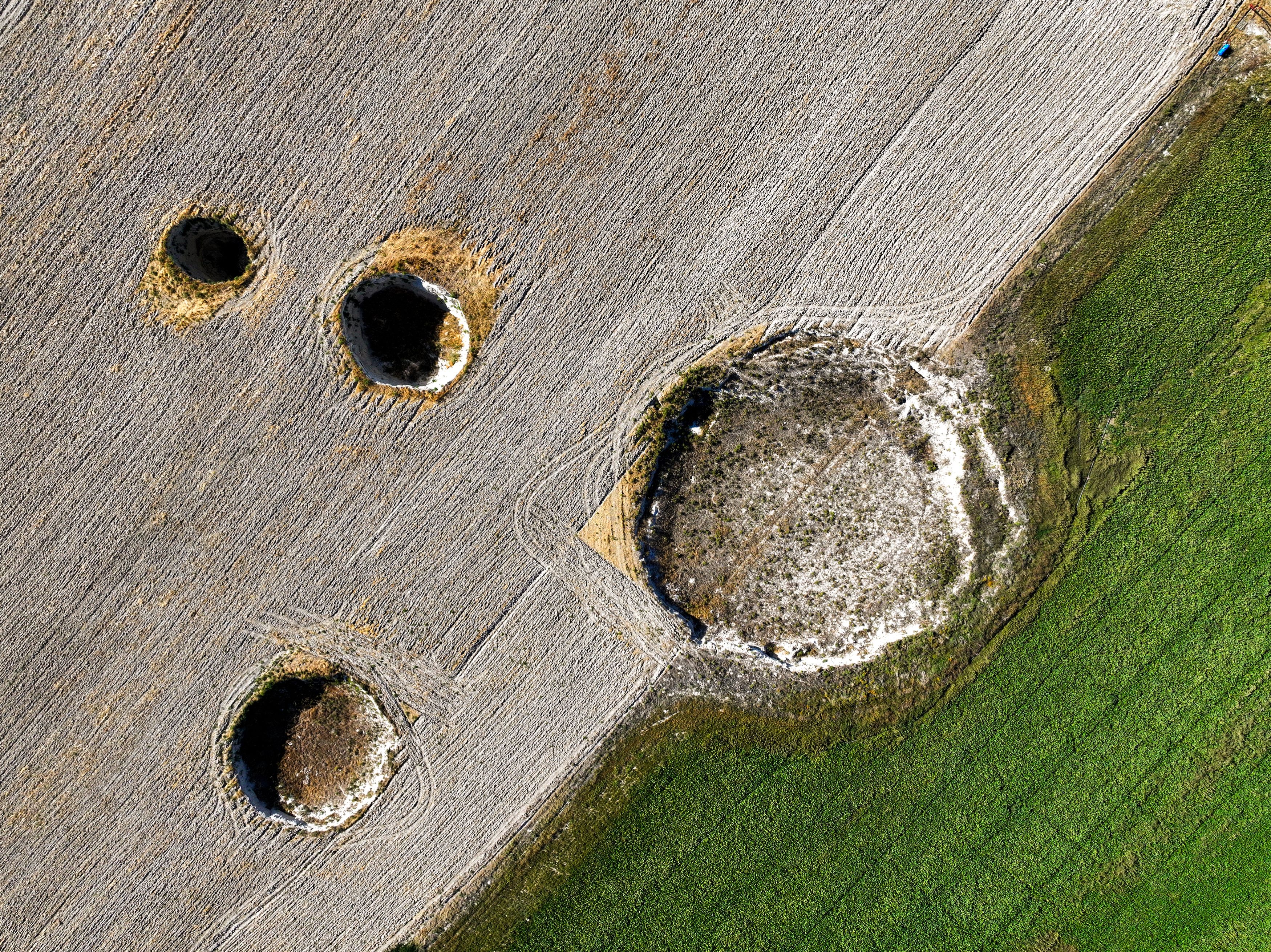 An aerial view of sinkholes (obruk), caused by some form of collapse of the surface layer, in Konya, Turkiye on September 17, 2024. Many sinkholes are observed in the fields of Eseli Plateau located within the borders of Resadiye Neighborhood in the north-west of Karapinar district, where sinkhole formation has increased rapidly in recent years. (Photo by Serhat Cetinkaya/Anadolu via Getty Images)