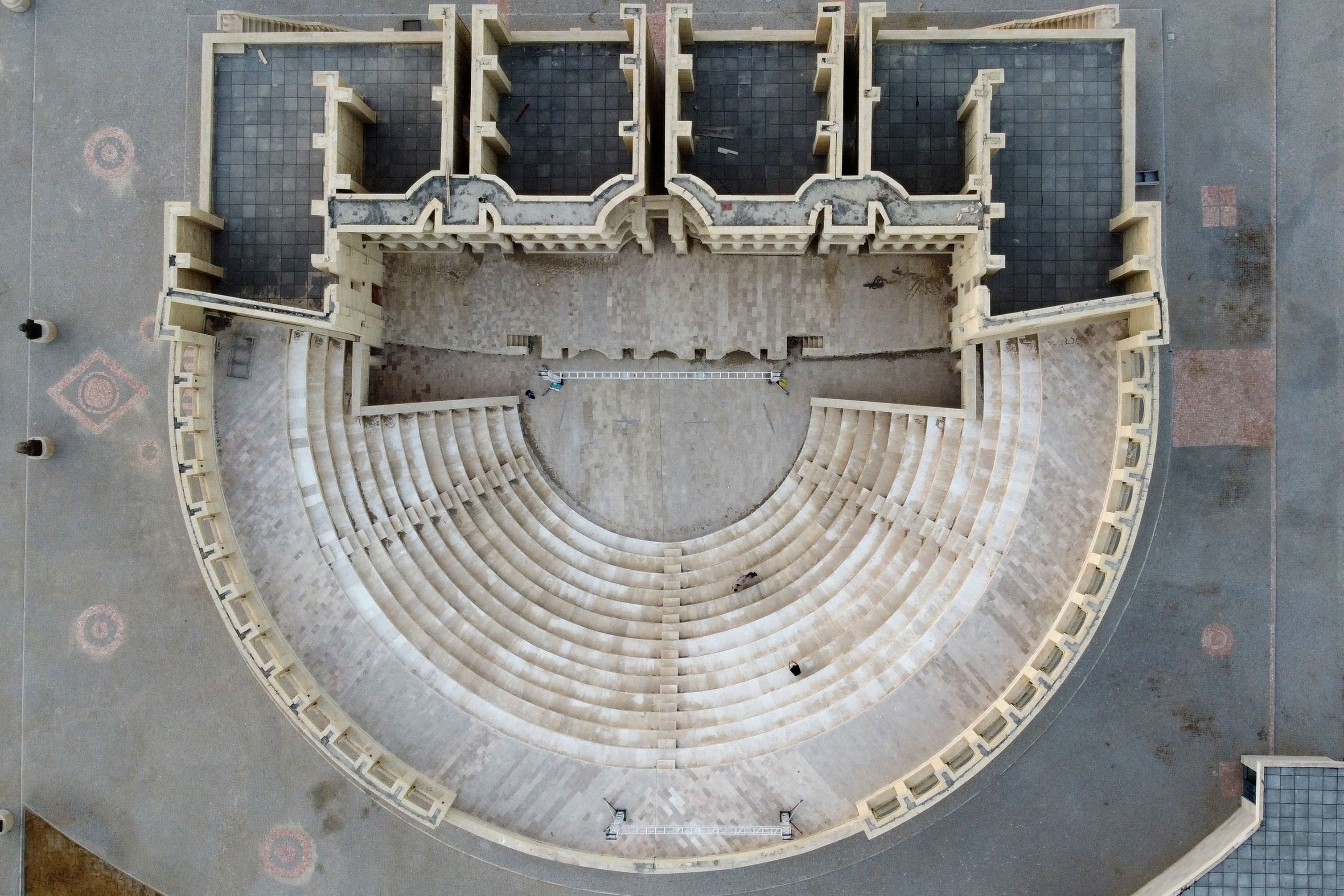 This picture shows an aerial view of an open air Sumerian theatre part of Ur Tourist City Project in central Iraq on September 19, 2024. (Photo by Asaad Niazi/AFP Photo)