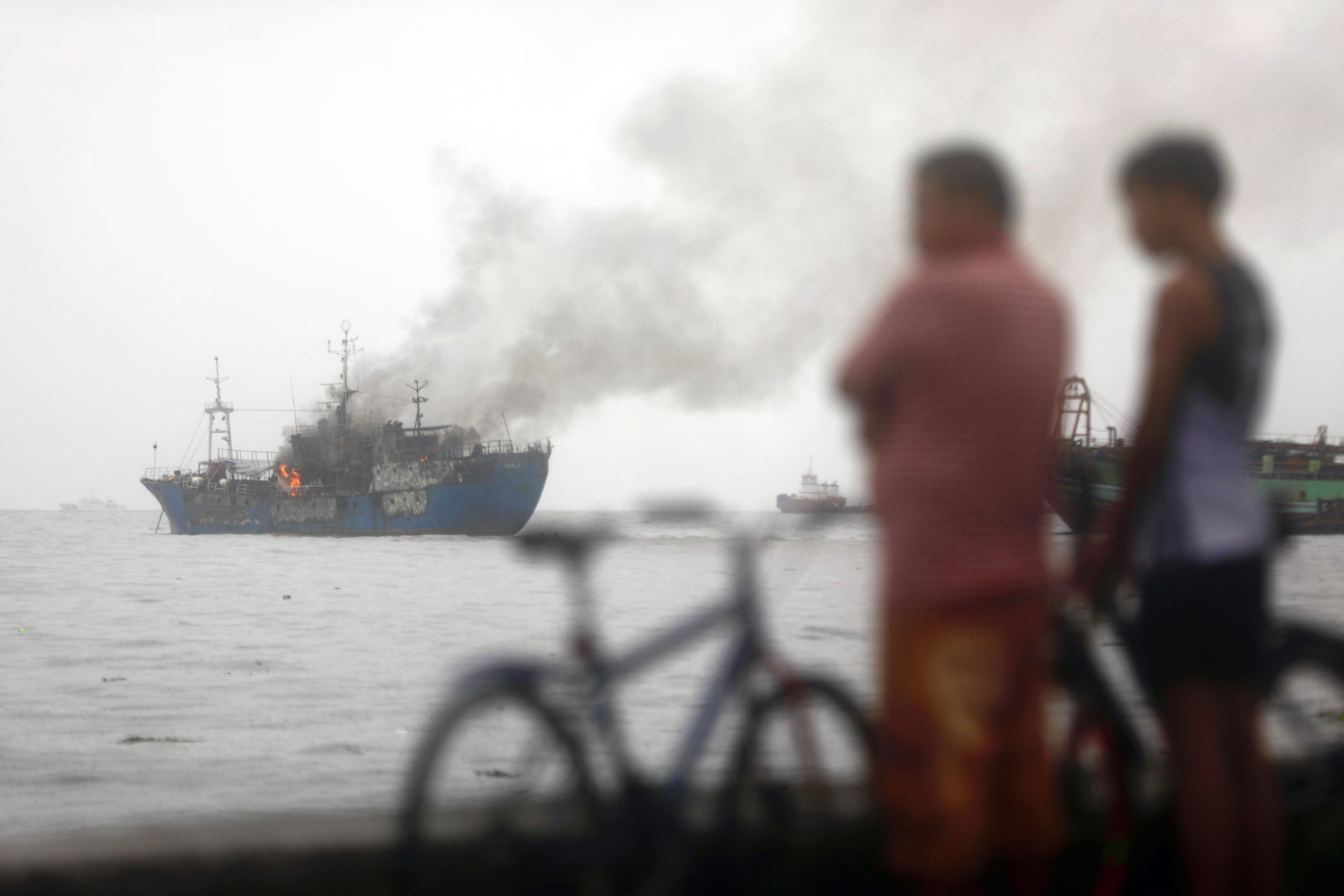 Locals look on as smoke rises from a burning ship that ran aground in Manila Bay, Philippines, 02 September 2024. At least four ships moored inside the Manila Bay were run aground after being hit by strong waves brought by Tropical Storm Yagi. In a report by the National Disaster Risk Reduction and Management (NDRRMC) on September 02, two people died and scores were injured by Tropical Storm Yagi. The state weather agency of the Philippines warned residents living along the typhoon's path to take precautionary measures due to possible flash floods in low-lying areas and landslides in mountainous villages. (Photo by Francis R Malasig/EPA/EFE)