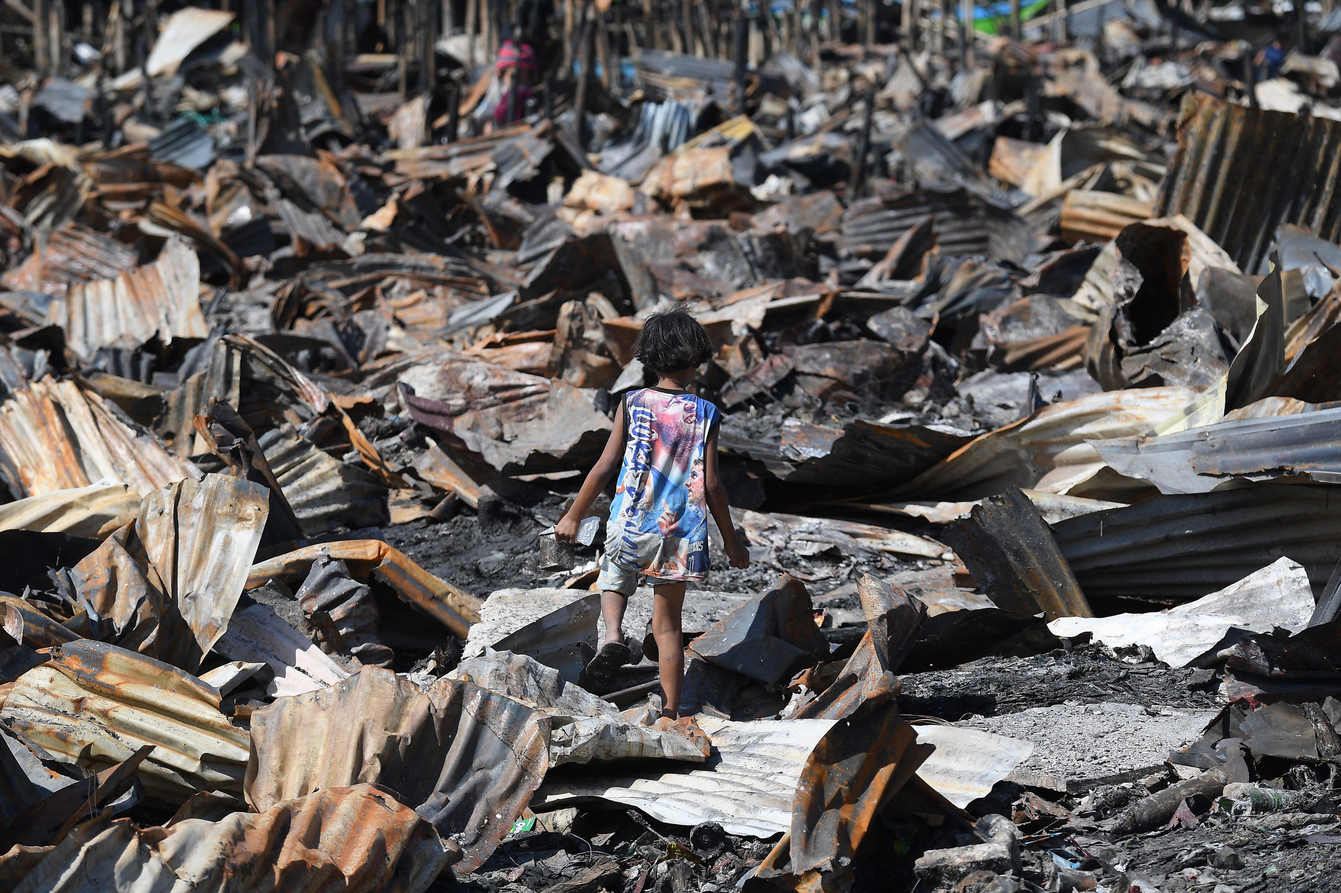A child looks for salvageable items among charred remains of houses following a fire the previous day in Bacoor town, Cavite province, west of Manila on September 11, 2024. Hundreds of residents were affected by the blaze, with no deaths reported. (Photo by Ted Aljibe/AFP Photo)
