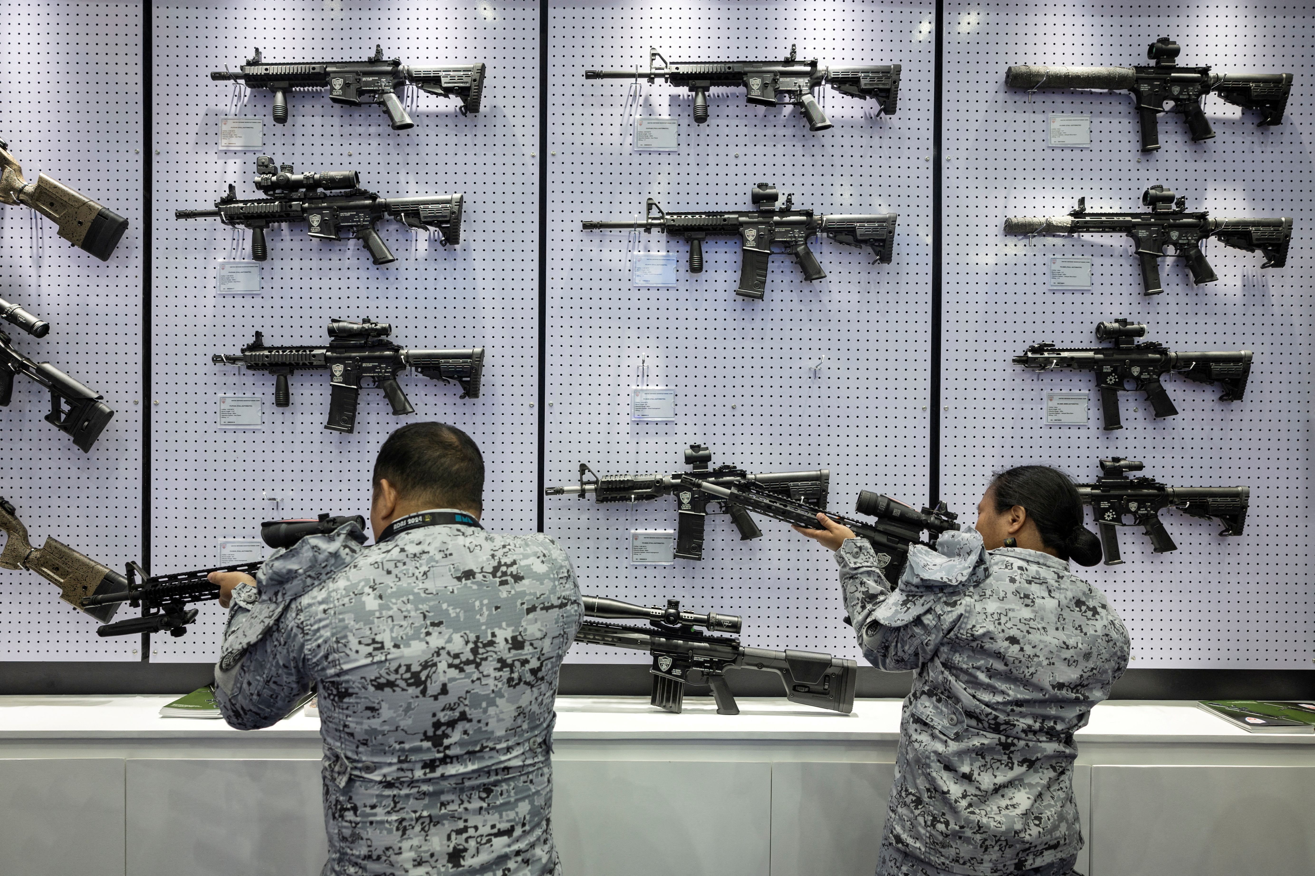 Philippine navy personnel check rifles on display during the Asian Defense and Security Exhibition at World Trade Center, Pasay City, Metro Manila, Philippines on September 25, 2024. (Photo by Eloisa Lopez/Reuters)