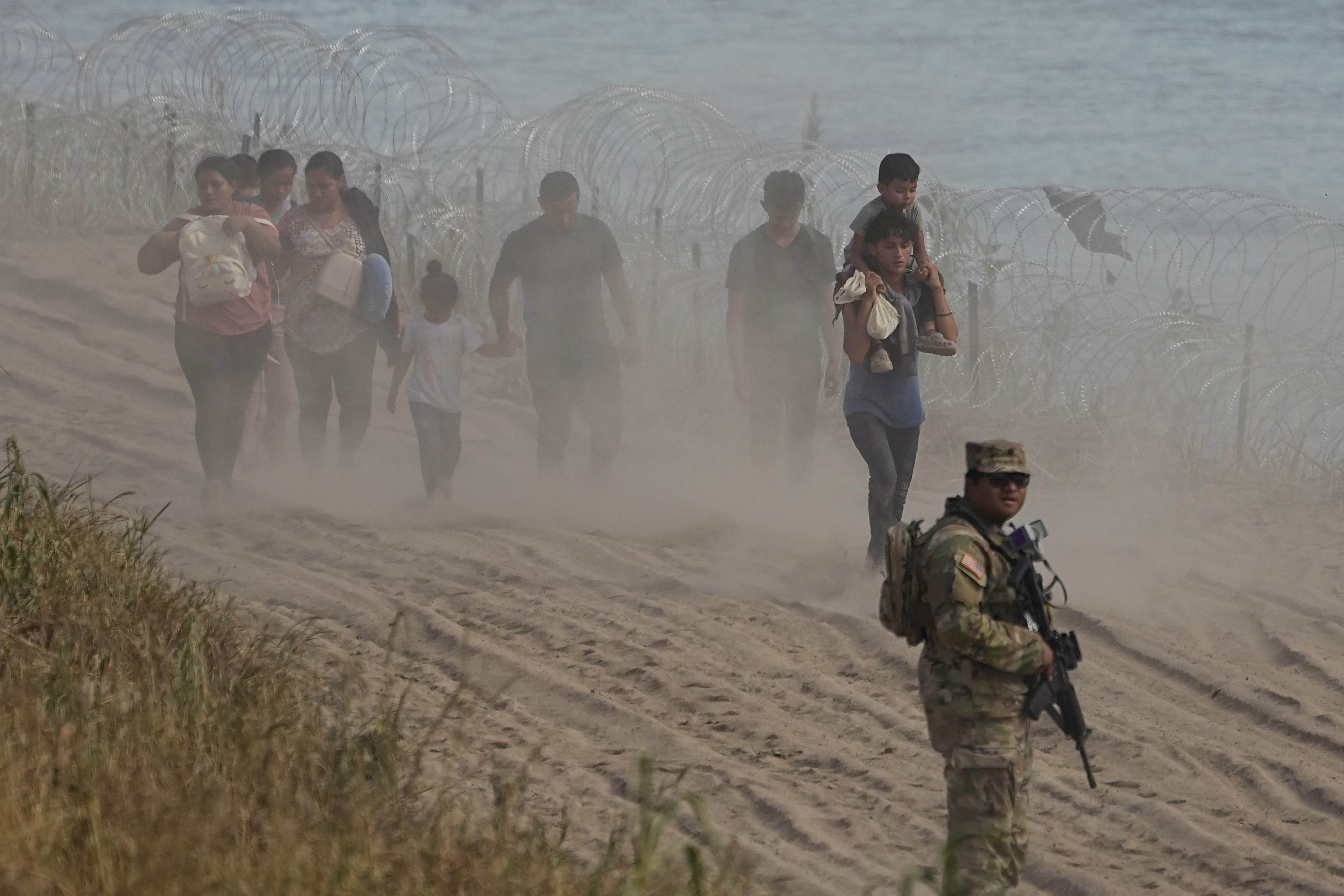 A Texas guardsman watches as migrants who crossed the Rio Grande from Mexico to the U.S. walk along concertina wire, Monday, July 31, 2023, in Eagle Pass, Texas. (Photo by Eric Gay/AP Photo)