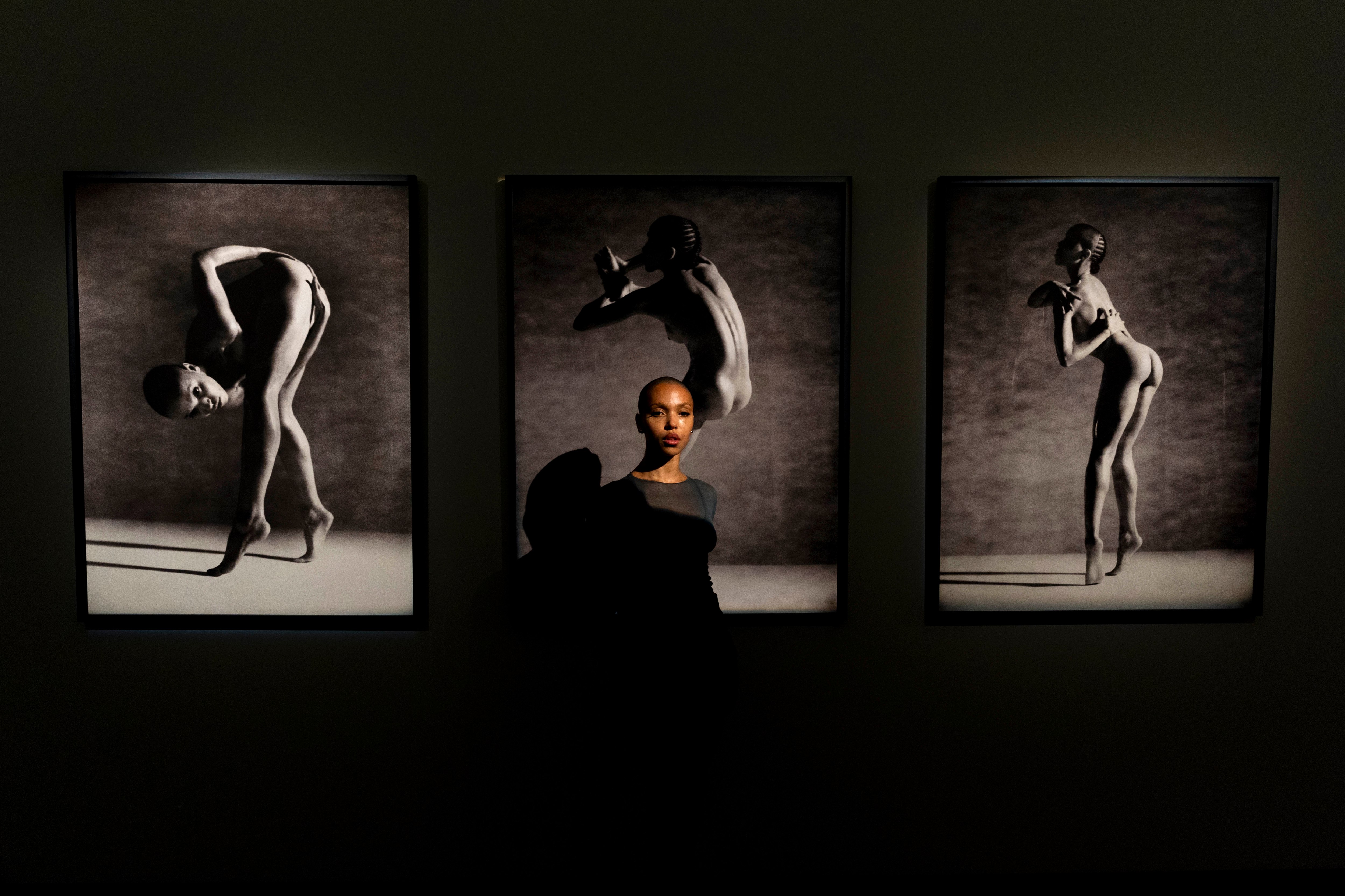 British singer-songwriter FKA Twigs poses for a portrait infront of photographs by Jordan Hemingway during a preview of her artwork “The Eleven”, a durational piece featuring a rotating group of eleven “movers”, which will include Twigs herself and a changing cast of special guests, at Sotheby's London on Friday, September 13, 2024. (Photo by Jordan Pettitt/PA Images via Getty Images)