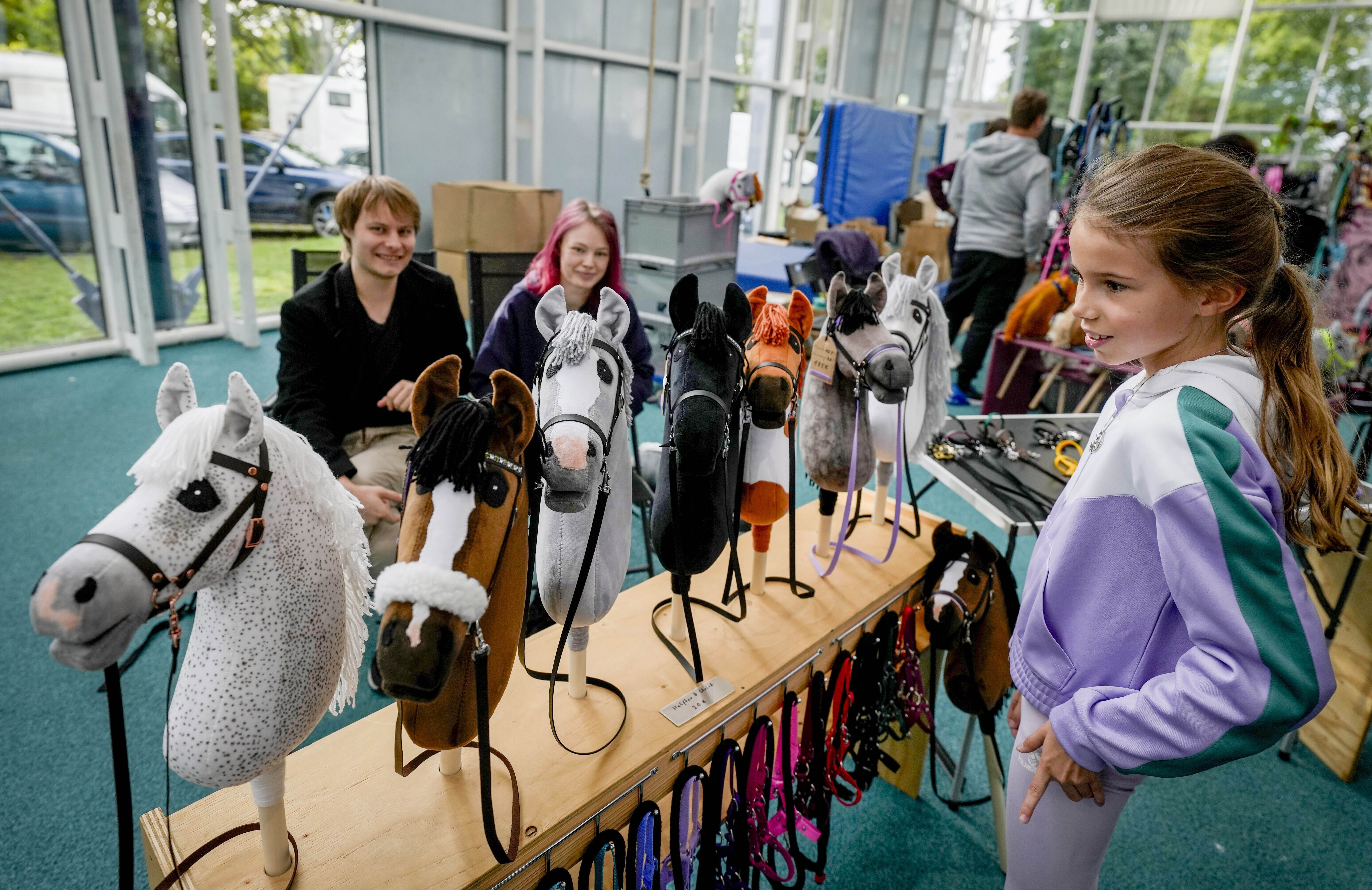 A vendor offers hobby horses for sale at the first German Hobby Horsing Championship in Frankfurt, Germany, Saturday, September 14, 2024. (Photo by Michael Probst/AP Photo)