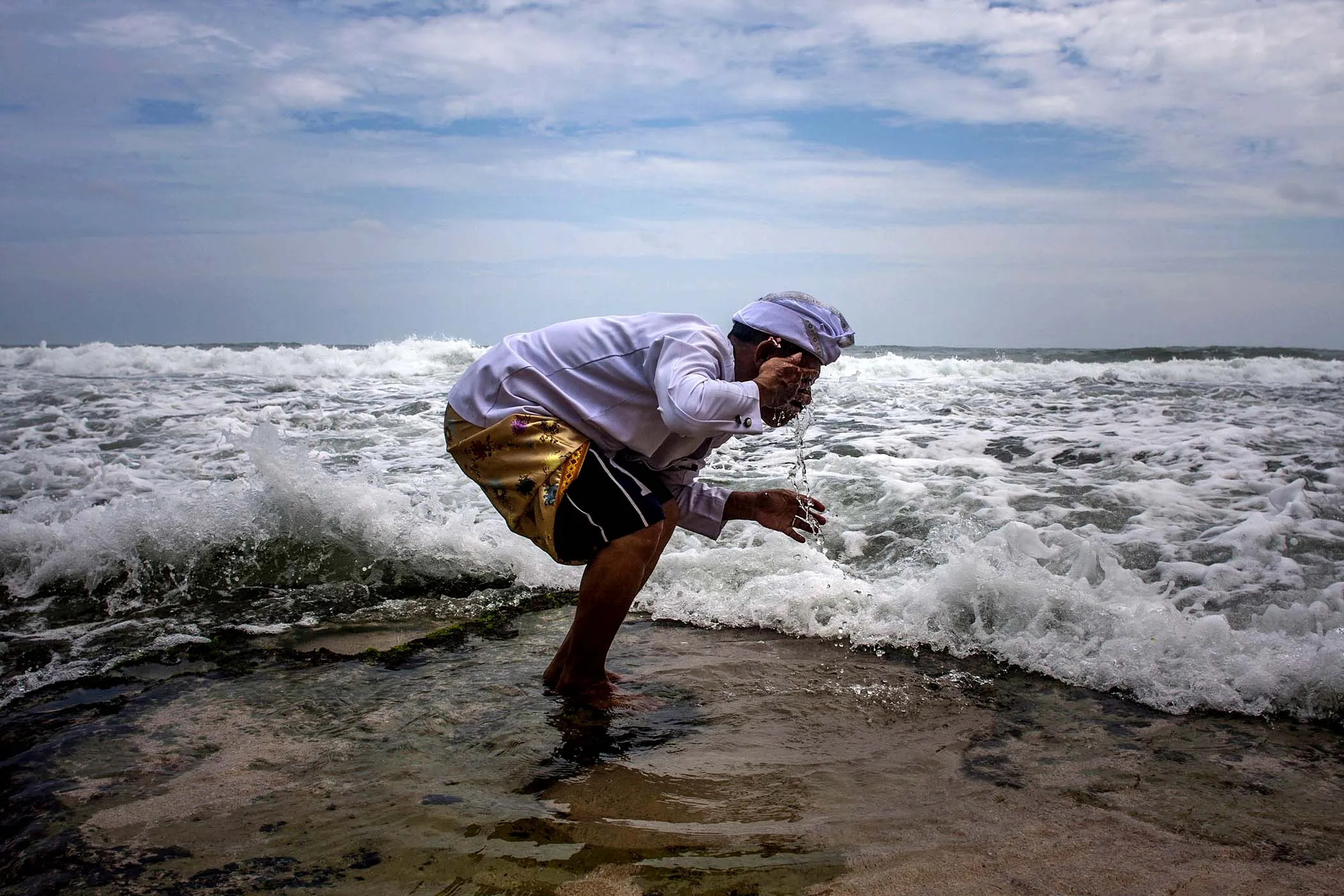 A Hindu priest washes his face with sea water during a religious ceremony called Melasti on Ngobaran Beach in Yogyakarta, Indonesia, on February 25, 2013. Melasti is performed a week ahead of Balinese Hindu's Day of Silence to purify the universe from bad influences, bad deeds and bad thoughts. (Photo by Gembong Nusantara/Associated Press)