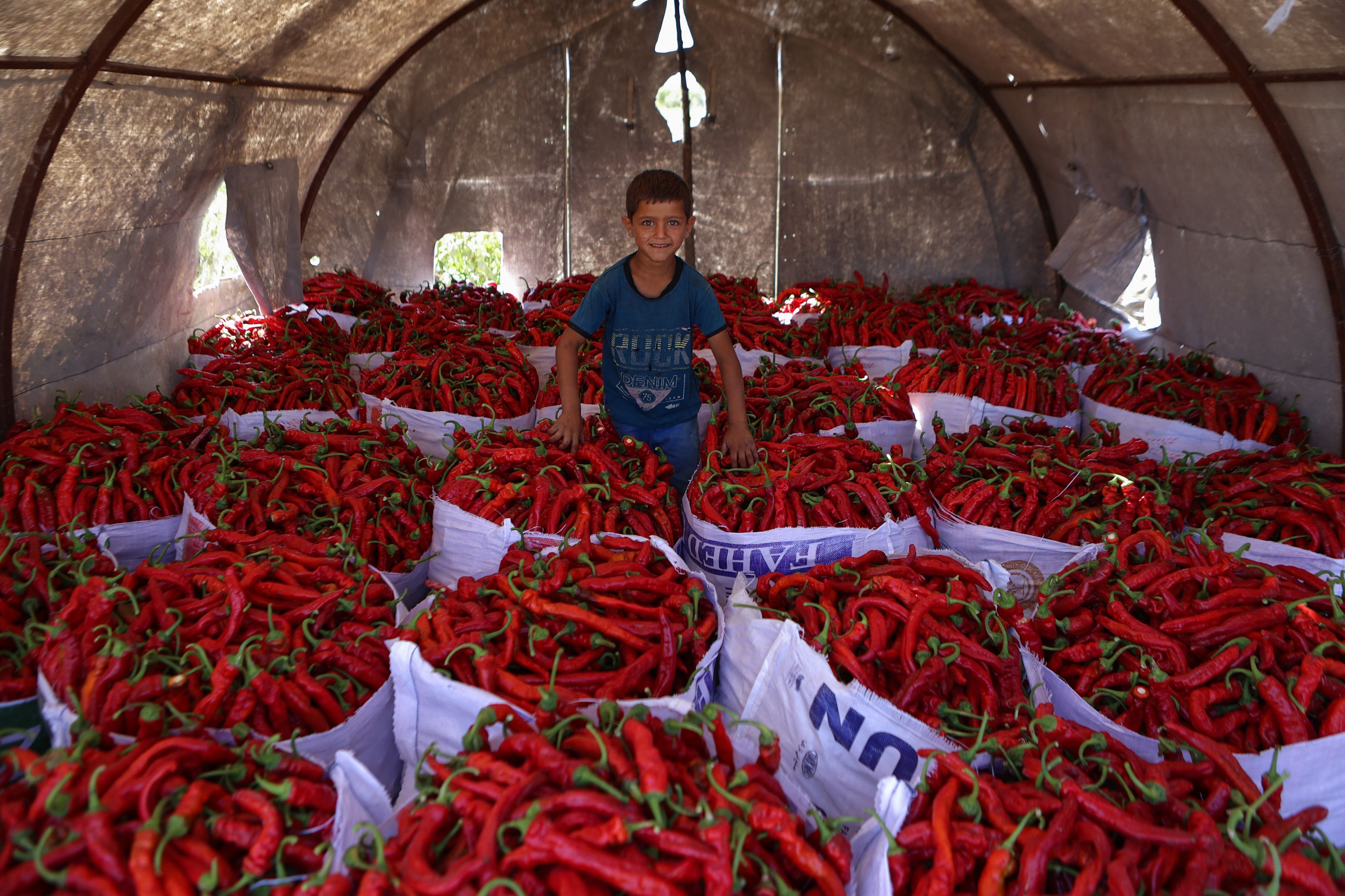 A boy poses amid sacks of freshly-picked red peppers in a field in Salqin village in Syria's rebel-held Idlib province, near the border with Turkey, on September 14, 2024. During harvest season, Salqin, alongside other towns of Syria's northwestern rebel-held Idlib region traditionally growing this crop, is colored red as farmers process the peppers, drying them on balconies and rooftops to produce flakes, paste, and powder, to be sold in local or external markets, a livelihood which has become threatened in recent years due to its increasing costs amid climate change and conflict. (Photo by Aaref Watad/AFP Photo)