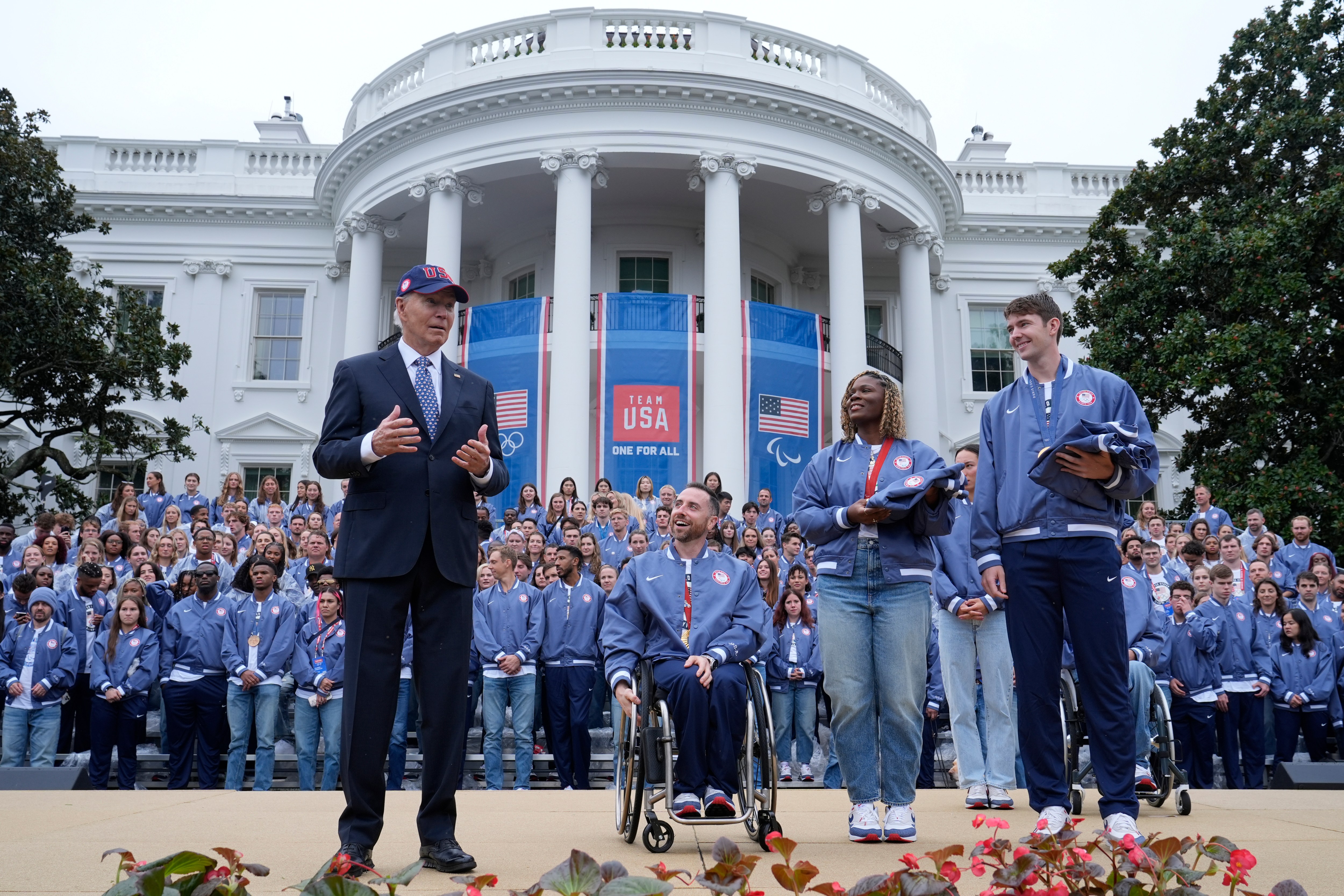 President Joe Biden, from left, speaks as Paralympic wheelchair basketball player Steve Serio, Paralympic sitting volleyball player Nicky Nieves, and Olympic rower Nick Mead, listen during an event celebrating the 2024 U.S. Olympic and Paralympic teams on the South Lawn of the White House in Washington, Monday, September 30, 2024. (Photo by Susan Walsh/AP Photo)