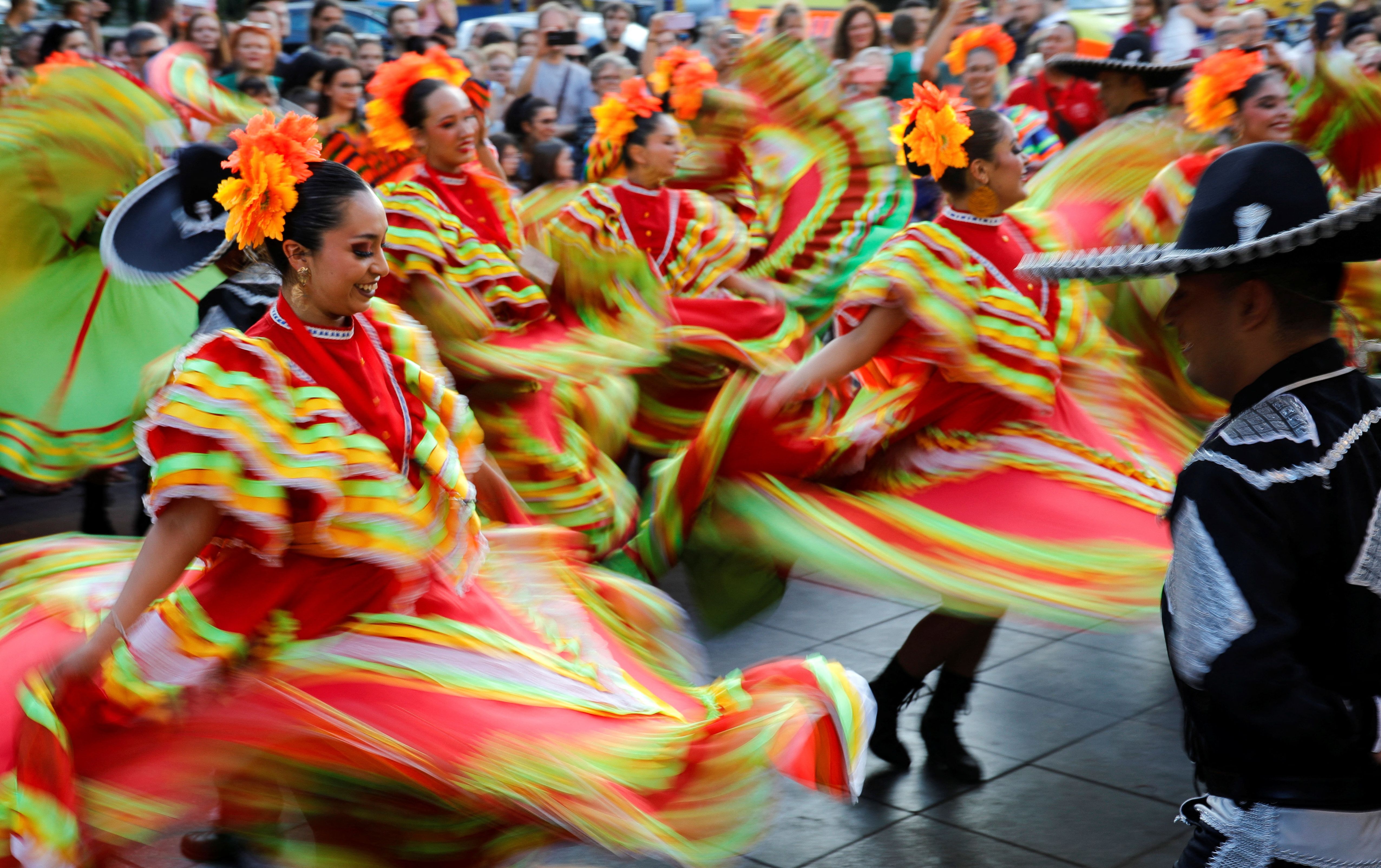 Folk dancers from Mexico participate in a folk dance festival in Bitola, North Macedonia on July 26, 2023. (Photo by Ognen Teofilovski/Reuters)