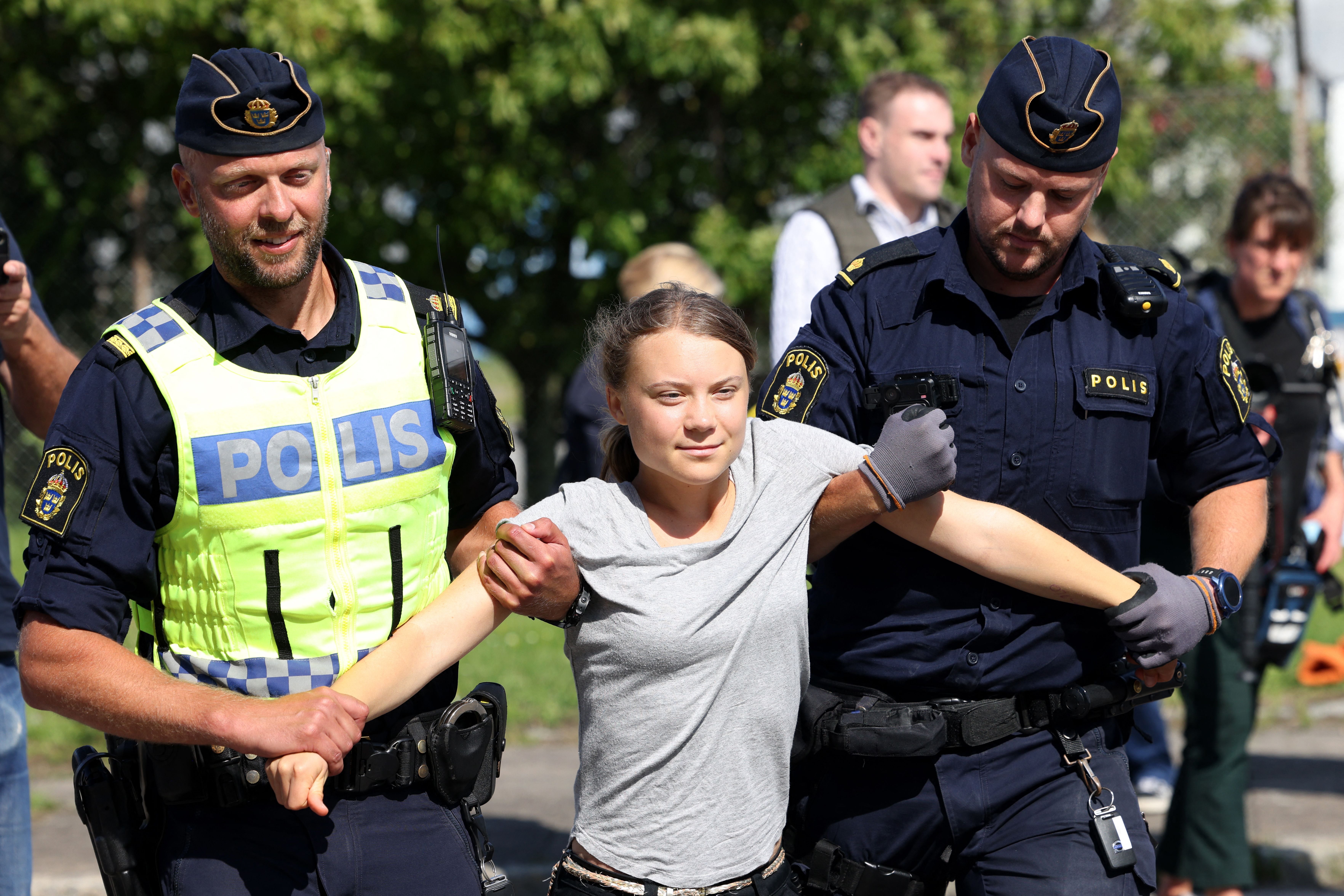 Climate activist Greta Thunberg is carried away by police officers after she took part in a new climate action in Oljehamnen in Malmo, Sweden on July 24, 2023, shortly after the city's district court convicted and sentenced her to a fine for disobeying police at a rally last month during a climate action in the Norra hamnen neighbourhood of Malmo. Thunberg was fined on Monday for disobeying police at a rally last month, but said she acted out of necessity due to the climate crisis. (Photo by Andreas Hillergren/TT News Agency via AFP Photo)