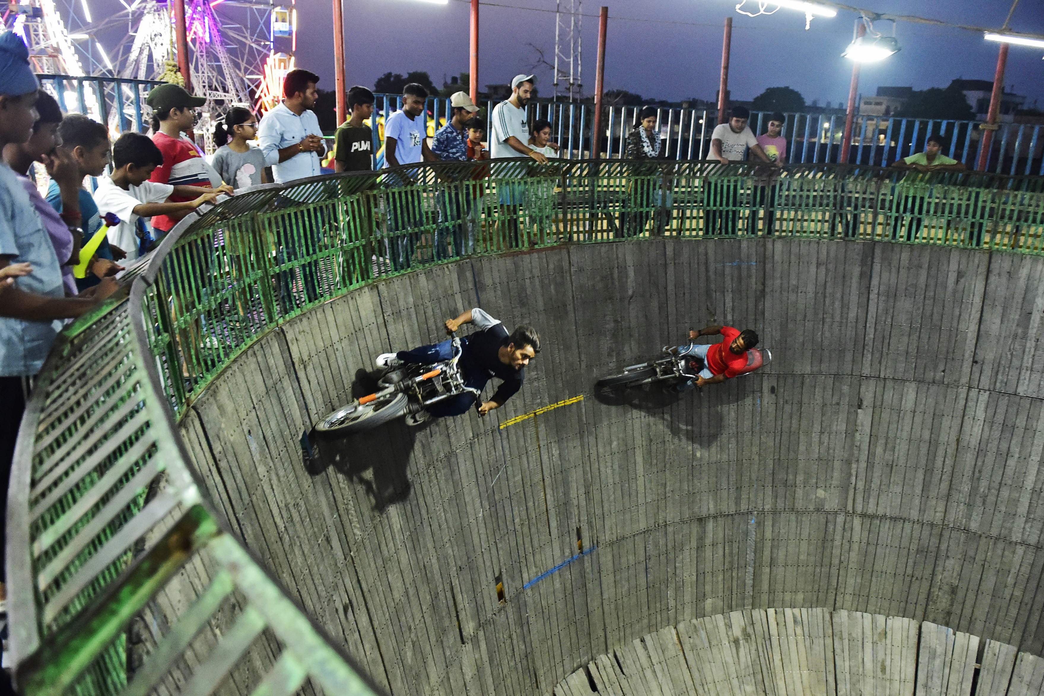 Stuntmen ride their motorbikes along the wall of a wooden structure during the 'Well of Death' show at a fair in Jalandhar on September 16, 2024. (Photo by Shammi Mehra/AFP Photo)