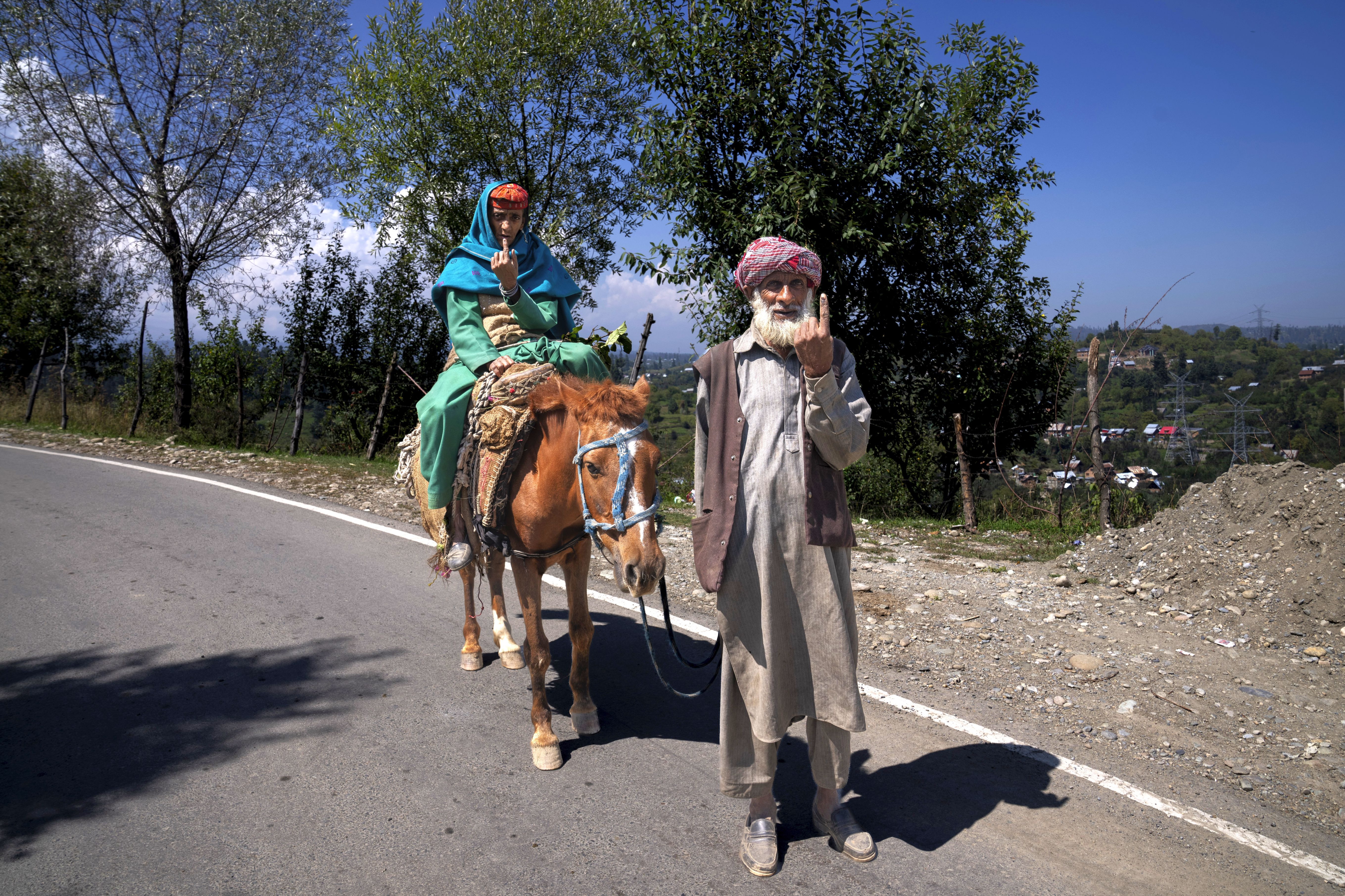 Ali Mohammad his wife Roshini, sitting on horseback, show the indelible ink mark on their index finger after casting their vote in Pehlipora, south of Srinagar, Indian controlled Kashmir, Wednesday, September 18, 2024. (Photo by Dar Yasin/AP Photo)