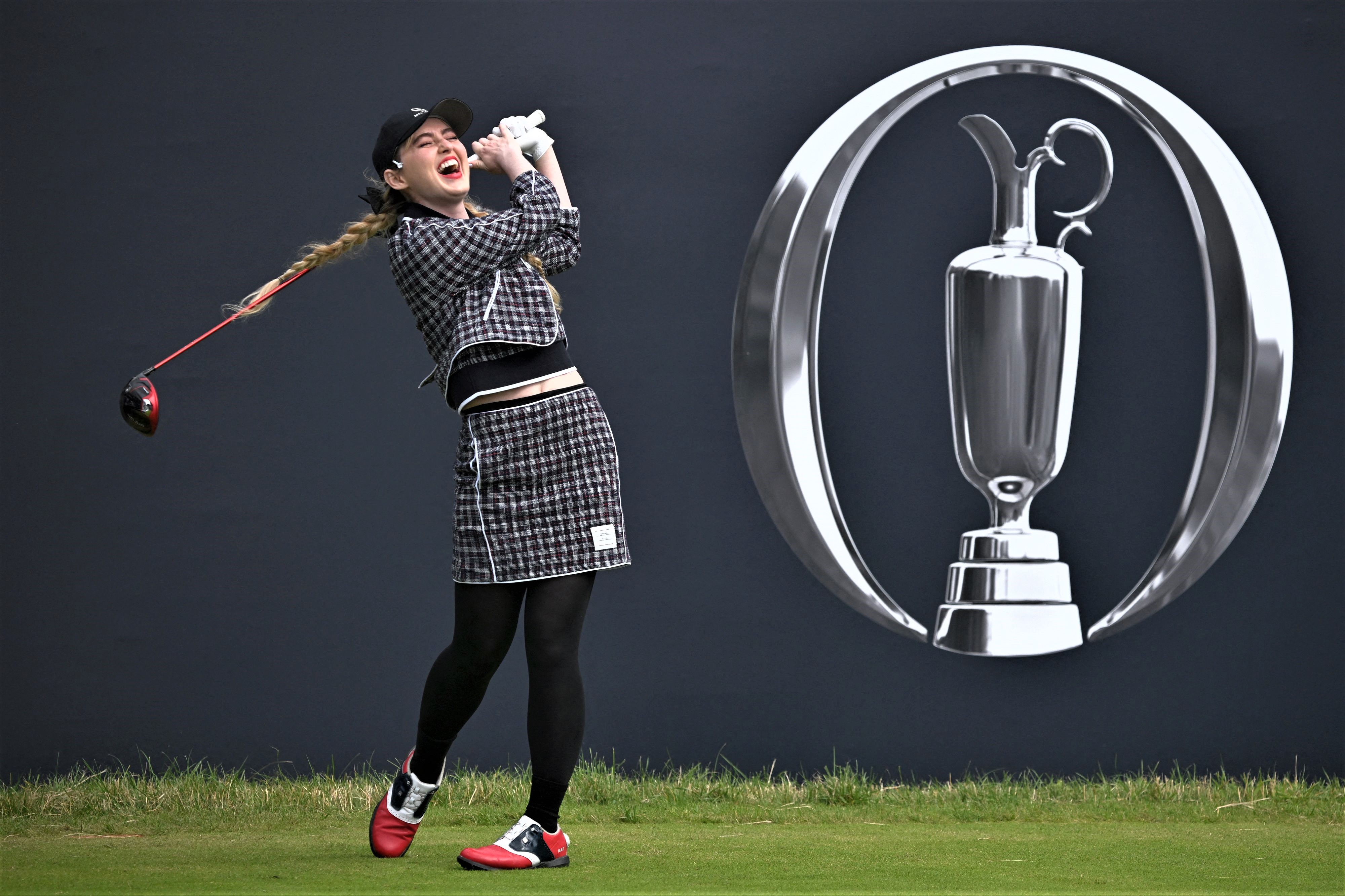 US actress Kathryn Newton reacts on the 1st tee as she takes part in the Open Invitational celebrity competition, ahead of the 151st British Open Golf Championship at Royal Liverpool Golf Course in Hoylake, north west England on July 16, 2023. (Photo by Paul Ellis/AFP Photo)